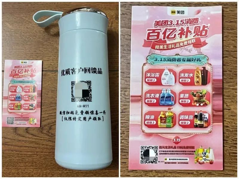 拆开包裹,是一个做工粗糙的塑料壳玻璃杯以及一张声称来自美团的“3·15专属好礼”。杯子上写着“优质客户回馈品”,并附有二维码,声称“微信扫码免费领取惊喜一份(仅限特定用户领取)”;卡片上写着“美团3.15消费百亿补贴,精美生活礼品免费领取”以及沐浴露、洗发水、果蔬等产品的照片,同样配有一个二维码,表示“扫码免费领取”。