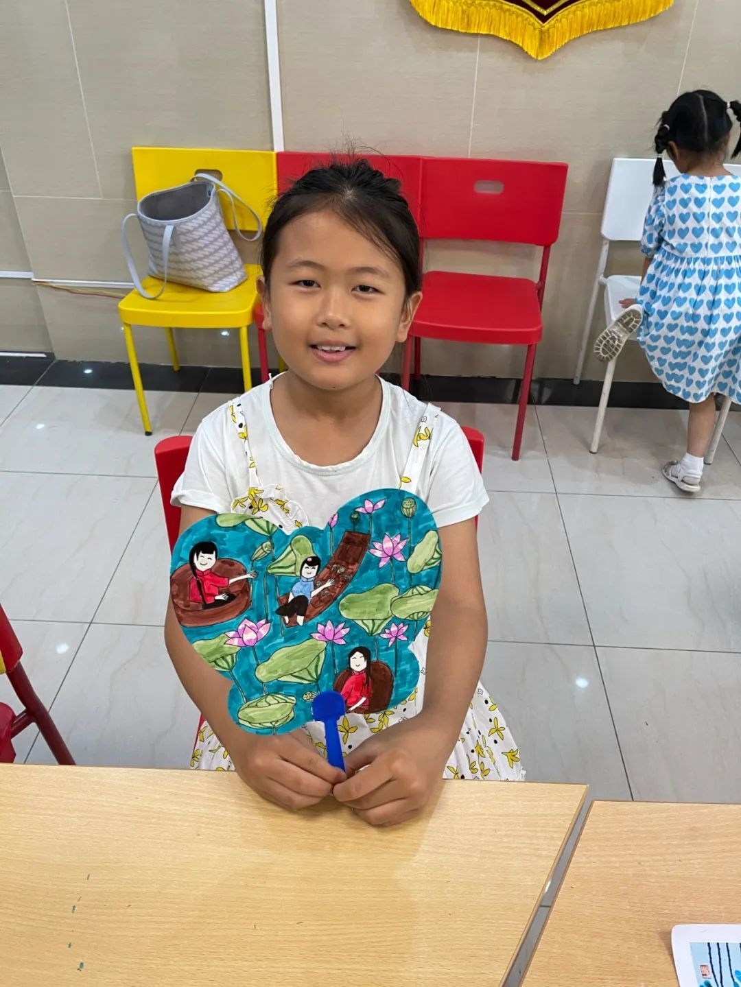 “金山农民画本身就是上海的非物质文化遗产,作为金山人我们也应该去弘扬传承农民画。”杨悦怡表示,为了增加课程的趣味性,她对课程内容进行了规划,开设有农民画扇面制作、农民画纸艺拼贴、农民画风车制作等,达到边学、边玩、可用的多效结合的目的。