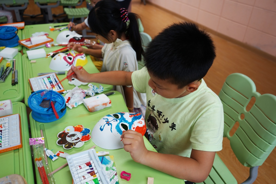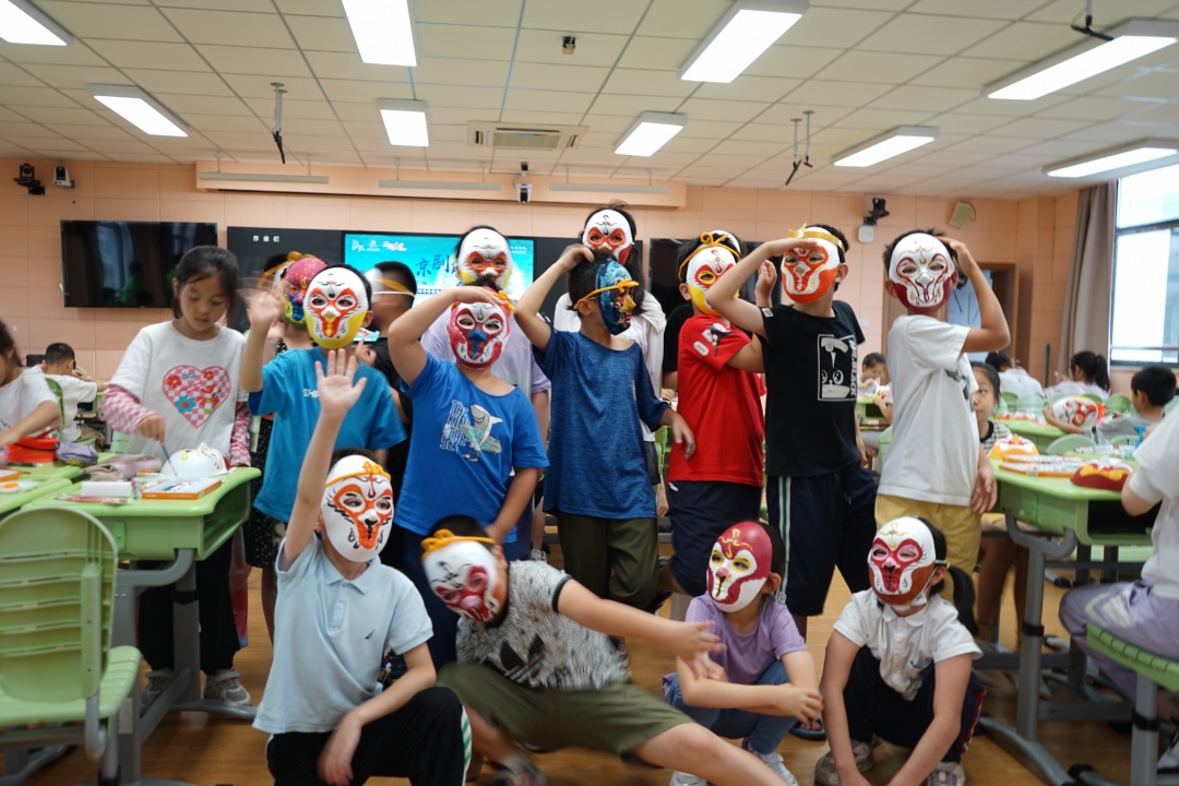 在了解了京剧基础知识后,孩子们通过亲手绘制“美猴王”脸谱,进一步感受国粹。拿起画笔的孩子们俨然成为了小小戏曲艺术家,全神贯注地勾画线条、填涂颜色。绘制完成后,孩子们戴上自己亲手绘制的脸谱,拿起金箍棒,摆好造型,用照片记录下欢乐的瞬间。