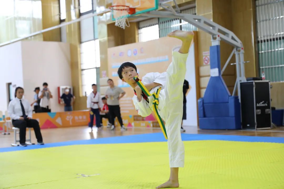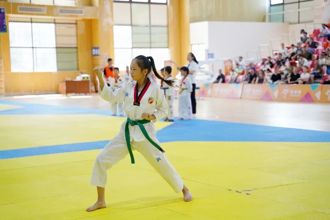 来自不同地区的青少年选手们也在赛场的切磋中取长补短。13岁的李墨轩来自东道主奉贤,从幼儿园大班开始学习跆拳道,已经有市级大赛的比赛经验,在奉贤区的龙队大赛中多次斩获冠军。暑假以来,无论多热,一直坚持在俱乐部训练。只见赛场上的她,扎起干练的高马尾,自信施展、稳稳发挥,顺利斩获B组女子冠军。“一开始学习跆拳道,家人是希望达到强身健体的作用。后来遇到好的教练,在学习中也慢慢爱上这项运动,特别是入选奉贤龙队后,也在进一步提升空翻飞踢等技巧,感觉这项运动特别能锻炼我的意志力。”