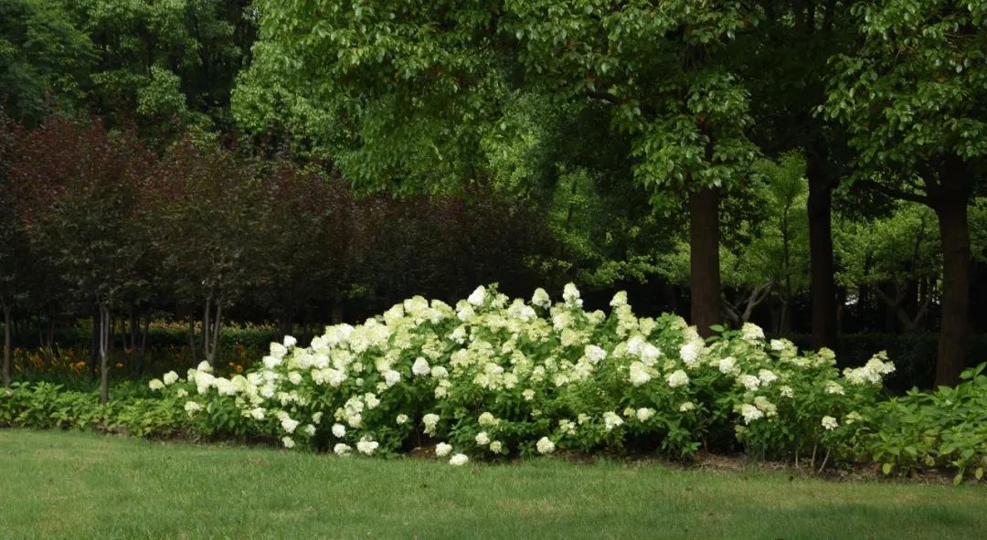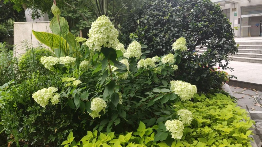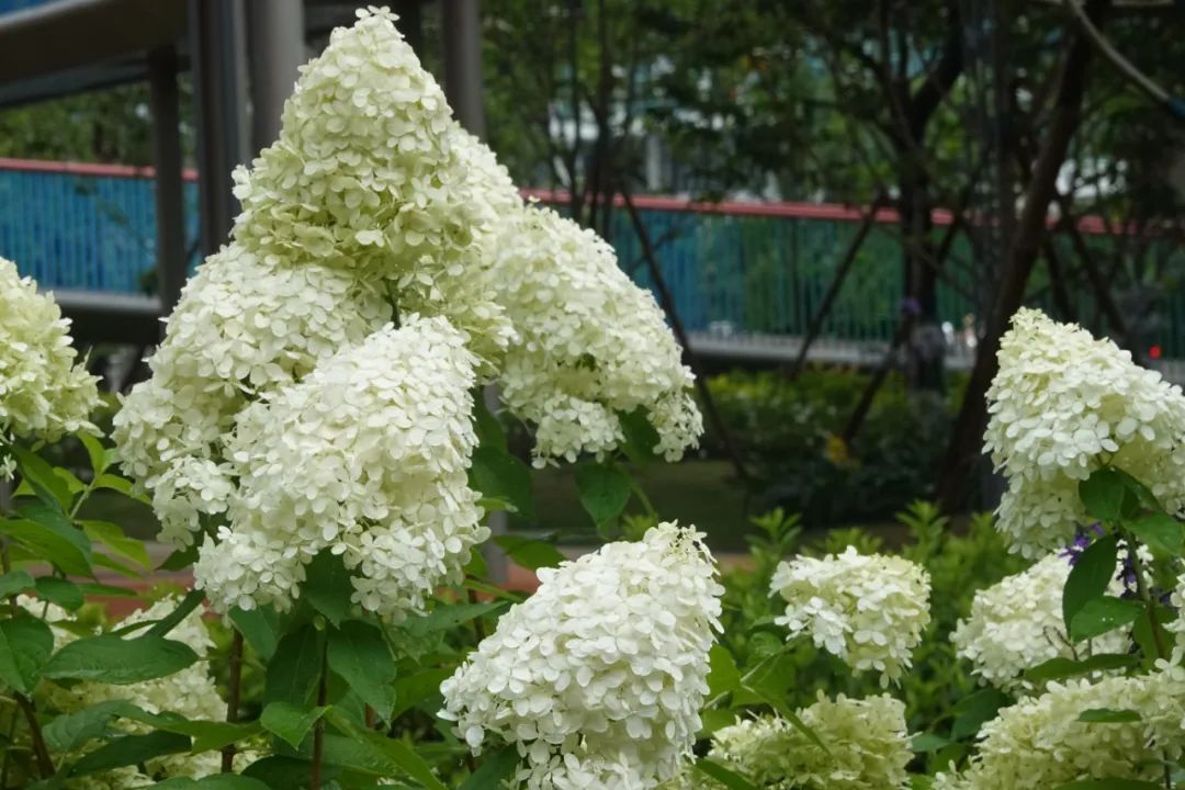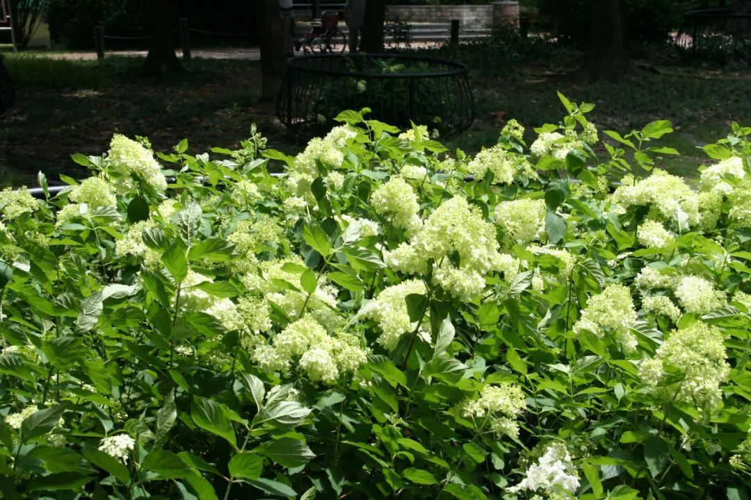 圆锥绣球品种繁多,有“石灰灯”“北极熊”“活力青柠”“魔幻月光”“霹雳贝贝”等。目前,上海绿地中应用较多的圆锥绣球品种是“石灰灯”。