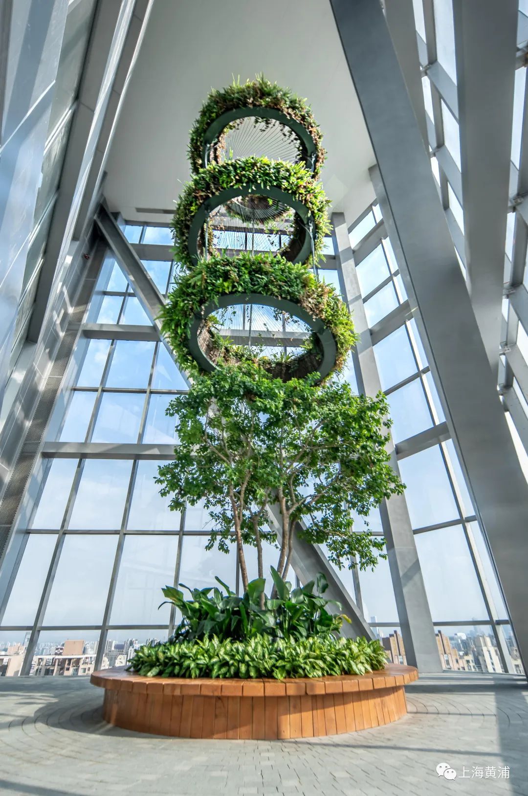 办公楼西南角特别设计为玻璃塔体,以每4层为单位挑高,形成多个独立生态系统空间——空中绿色垂直空间。种植培育4米高的铁冬青树及多样绿植,七座生态花园垂直叠列于大楼一隅,宛如一座伫立在办公楼宇间的温室花园,将城市绿意自然地融入办公楼中。