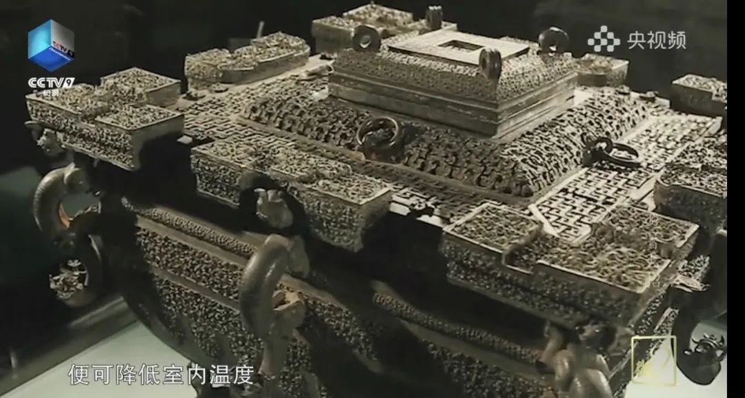 冰鉴是用青铜铸成的大型容器,分内外两层,在夹层里塞满冰块,把食物和美酒放在内层,盖上盖子,就可发挥保鲜的功效。若打开盖子,使冰块散发的冷气冒出,便可降低室内温度。