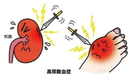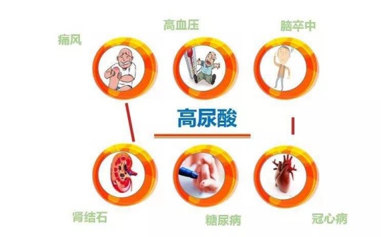 无论男性还是女性,非同日2次血尿酸水平超过420μmol/L,称之为高尿酸血症。过高的尿酸在血液中析出后,以尿酸单钠结晶的形式沉积于人体的组织中,导致痛风性关节炎、痛风石、痛风性肾结石等。长期的高尿酸还会导致急性或者慢性肾功能衰竭、代谢综合征、胰岛素抵抗、冠心病等。此外,高尿酸血症往往与高血压、高血脂、肥胖、高血糖等代谢因素并存,成为危害人类健康的共犯,影响着心脑肾等多个重要器官, 当尽早防治。