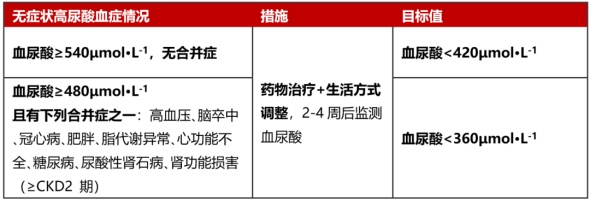对于需服用利尿剂且合并高尿酸血症的患者,首选非噻嗪类利尿剂,同时碱化尿液、多饮水,保持每日尿量在2000ml以上。对于高血压合并高尿酸血症患者,首选噻嗪类利尿剂以外的降压药物。有指征需服用小剂量阿司匹林的高尿酸血症患者建议碱化尿液、多饮水。