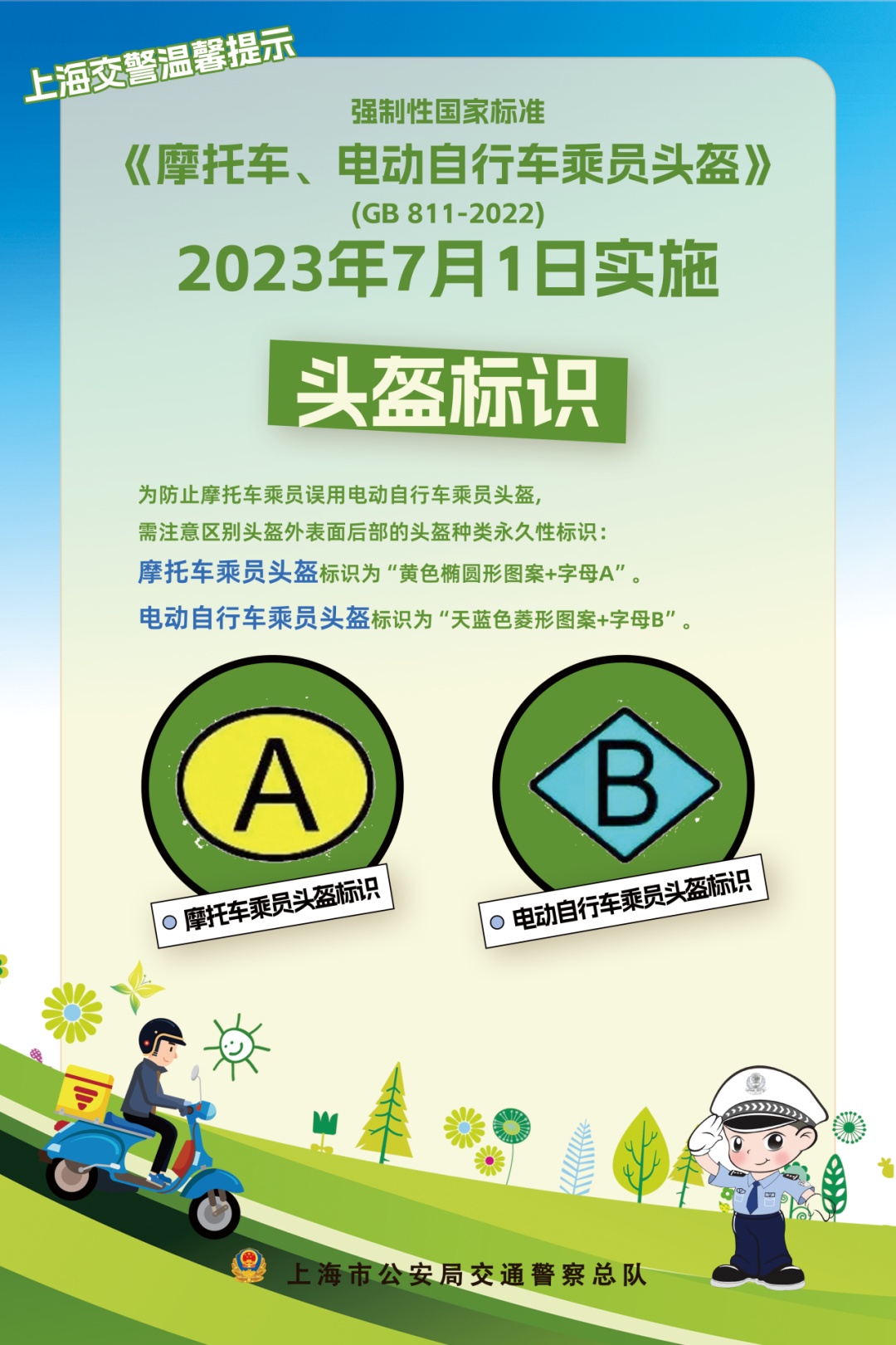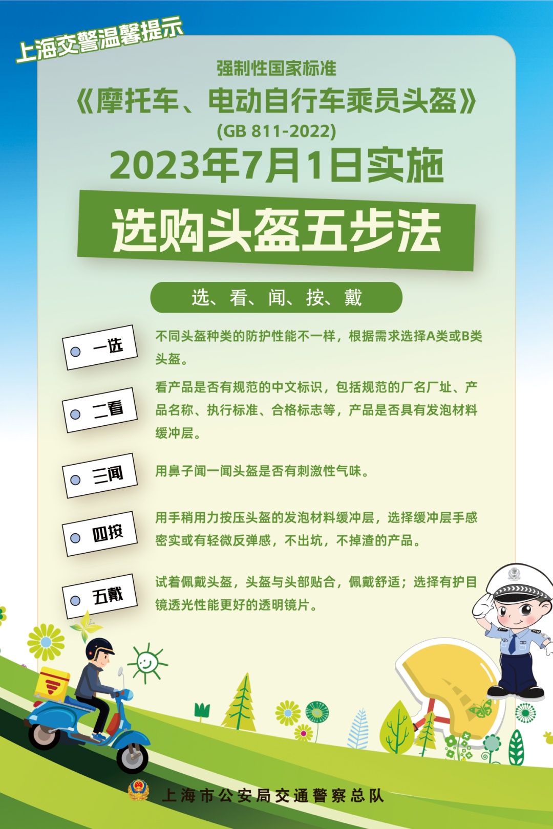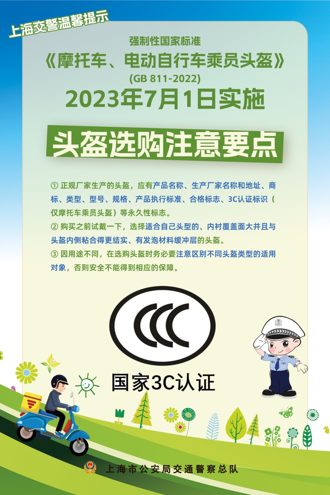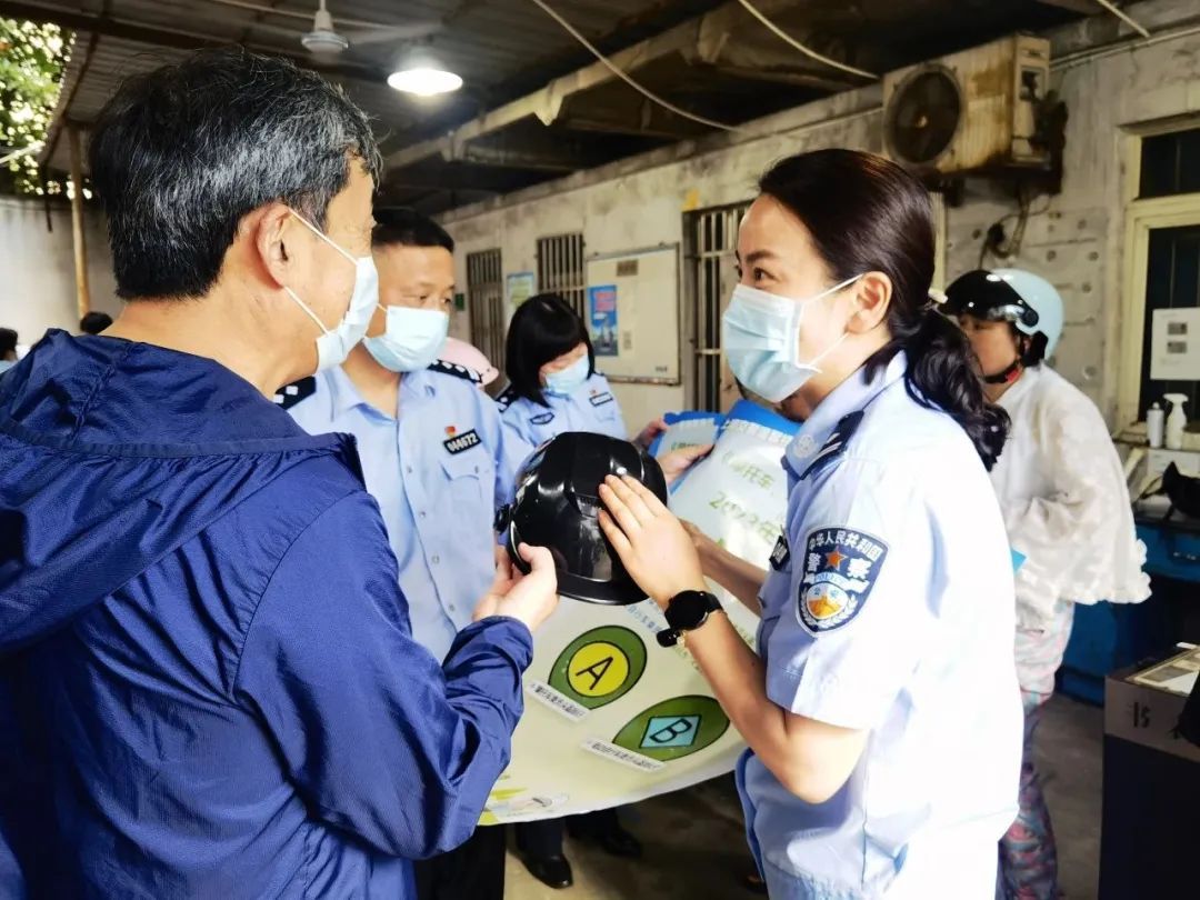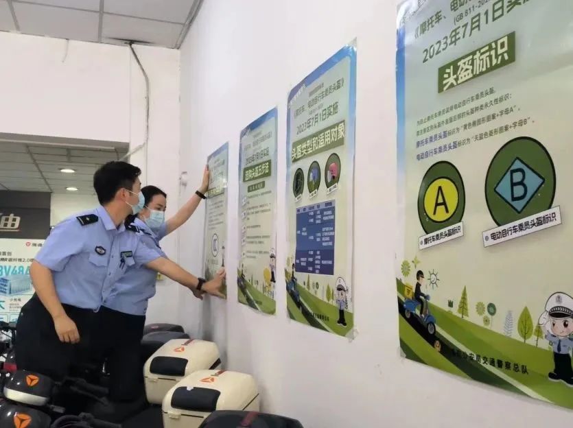 宝山交警支队在各电动自行车上牌点、销售网点对《摩托车、电动自行车乘员头盔》新规定进行宣传告知,并对市民群众普及法律法规。