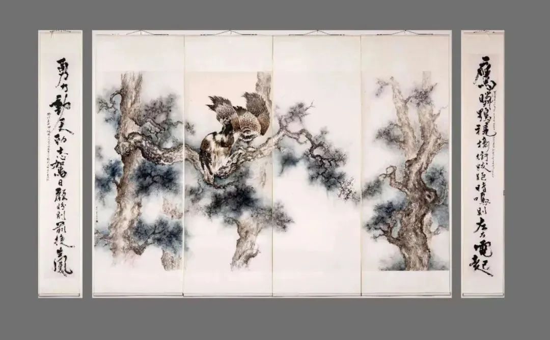 松鹰四联屏“鹰瞵鹗视”。上联:“鹰瞵鹗视,接冲拔距,暗鸣则左右电起。”;下联:“勇力动天,劲志驾日,顾盼则前后风生。”— 吴宗翰(癸卯)