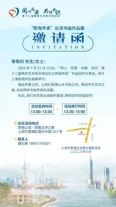 将于7月21日下午在上海市黄浦区思南公馆时区画廊举办第十二届两岸艺术新天地论坛“跨海传承”中国台湾书画作品分享会,有中国台湾已故书法家、教育家谢宗安先生之子谢安东先生,书画家简品淑、韦仰哲、吴宗翰老师为嘉宾,分享会上将展出数十件艺术作品,共绘两岸文化传承。