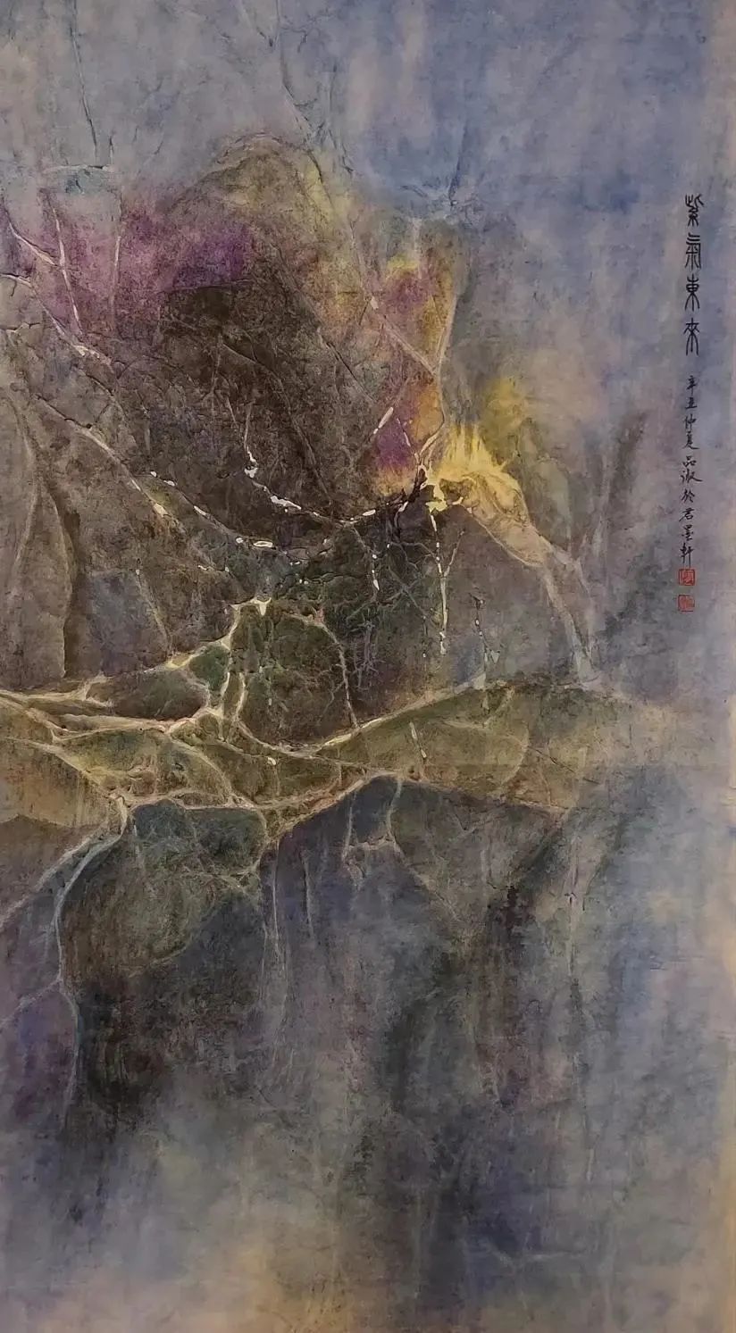 ”紫气东来“作此画动机:曾烧制钧瓷,醉心于钧瓷之美-十窑九变、钧瓷无双、五彩渗化,每一小方寸放大都是幅令人激赏的画作。因此,把画室当实验室,不断尝试,希望能作出大格局的画作,而它细部仍值得玩赏。— 简品淑(辛丑仲夏)