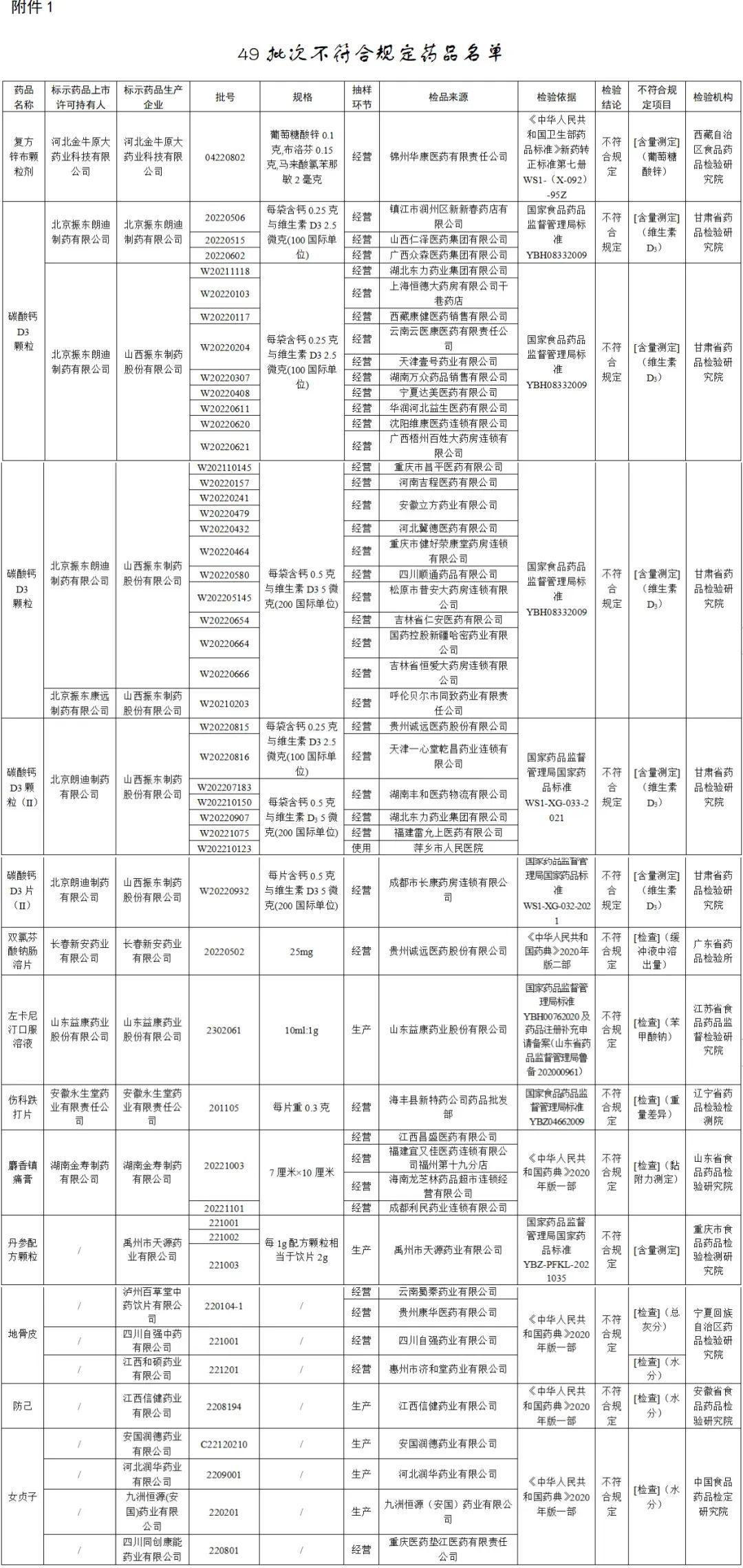 经甘肃省药品检验研究院等10家药品检验机构检验,标示为北京朗迪制药有限公司等16家企业生产的碳酸钙D3颗粒等49批次药品不符合规定。现将相关情况通告如下: 一、经西藏自治区食品药品检验研究院检验,标示为河北金牛原大药业科技有限公司生产的1批次复方锌布颗粒剂不符合规定,不符合规定项目为含量测定。 经甘肃省药品检验研究院检验,标示为北京振东朗迪制药有限公司、北京振东朗迪制药有限公司委托山西振东制药股份有限公司、北京振东康远制药有限公司委托山西振东制药股份有限公司生产的24批次碳酸钙D3颗粒不符合规定,不符合规定项目均为含量测定。 经甘肃省药品检验研究院检验,标示为北京朗迪制药有限公司委托山西振东制药股份有限公司生产的7批次碳酸钙D3颗粒(Ⅱ)不符合规定,不符合规定项目均为含量测定。 经甘肃省药品检验研究院检验,标示为北京朗迪制药有限公司委托山西振东制药股份有限公司生产的1批次碳酸钙D3片(Ⅱ)不符合规定,不符合规定项目为含量测定。 经广东省药品检验所检验,标示为长春新安药业有限公司生产的1批次双氯芬酸钠肠溶片不符合规定,不符合规定项目为缓冲液中溶出量。 经江苏省食品药品监督检验研究院检验,标示为山东益康药业股份有限公司生产的1批次左卡尼汀口服溶液不符合规定,不符合规定项目为苯甲酸钠。 经辽宁省药品检验检测院检验,标示为安徽永生堂药业有限责任公司生产的1批次伤科跌打片不符合规定,不符合规定项目为重量差异。 经山东省食品药品检验研究院检验,标示为湖南金寿制药有限公司生产的2批次麝香镇痛膏不符合规定,不符合规定项目为黏附力测定。 经重庆市食品药品检验检测研究院检验,标示为禹州市天源药业有限公司生产的3批次丹参配方颗粒不符合规定,不符合规定项目为含量测定。 经宁夏回族自治区药品检验研究院检验,标示为泸州百草堂中药饮片有限公司、四川自强中药有限公司、江西和硕药业有限公司生产的3批次地骨皮不符合规定,不符合规定项目包括总灰分、水分。 经安徽省食品药品检验研究院检验,标示为江西信健药业有限公司生产的1批次防己不符合规定,不符合规定项目为水分。 经中国食品药品检定研究院检验,标示为安国润德药业有限公司、河北润华药业有限公司、九洲恒源(安国)药业有限公司、四川同创康能药业有限公司生产的4批次女贞子不符合规定,不符合规定项目为水分。 二、对上述不符合规定药品,药品监督管理部门已要求相关企业和单位采取暂停销售使用、召回等风险控制措施,对不符合规定原因开展调查并切实进行整改。 三、国家药监局要求相关省级药品监督管理部门依据《中华人民共和国药品管理法》,组织对上述企业和单位存在的涉嫌违法行为立案调查,并按规定公开查处结果。 特此通告。 国家药监局 2023年7月14日