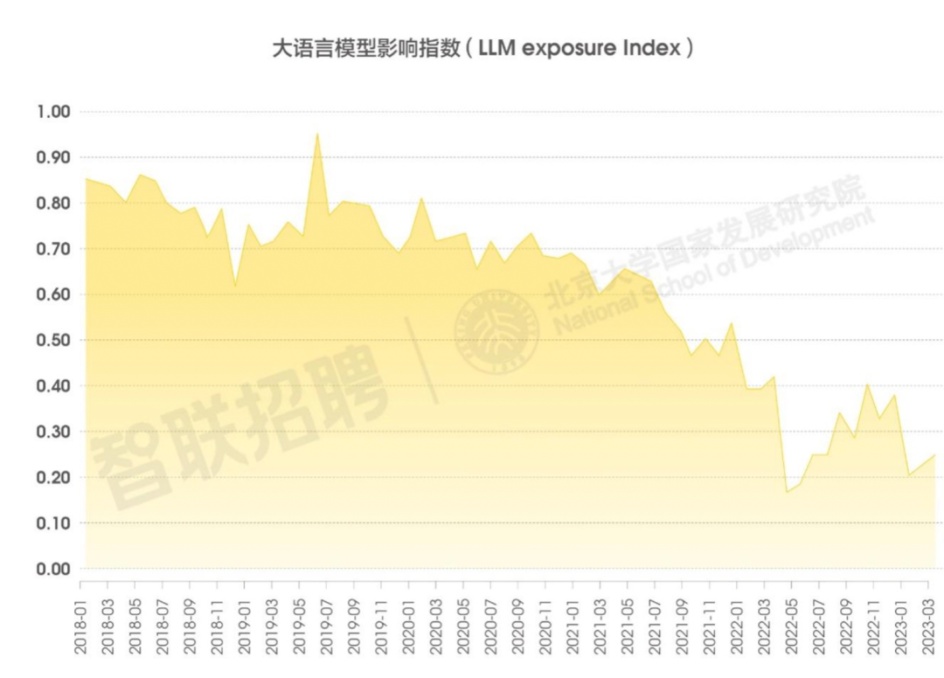 7月19日,北京大学国家发展研究院与智联招聘联合推出《AI大模型对我国劳动力市场潜在影响研究报告》(下称《报告》)。本报告基于2018年1月到2023年4月期间,智联招聘脱敏的岗位需求、求职者简历投递数据,以及求职者问卷调查而撰写。课题组通过对招聘岗位工作任务的文本分析,首次构建了各种职业的人工智能影响指数。