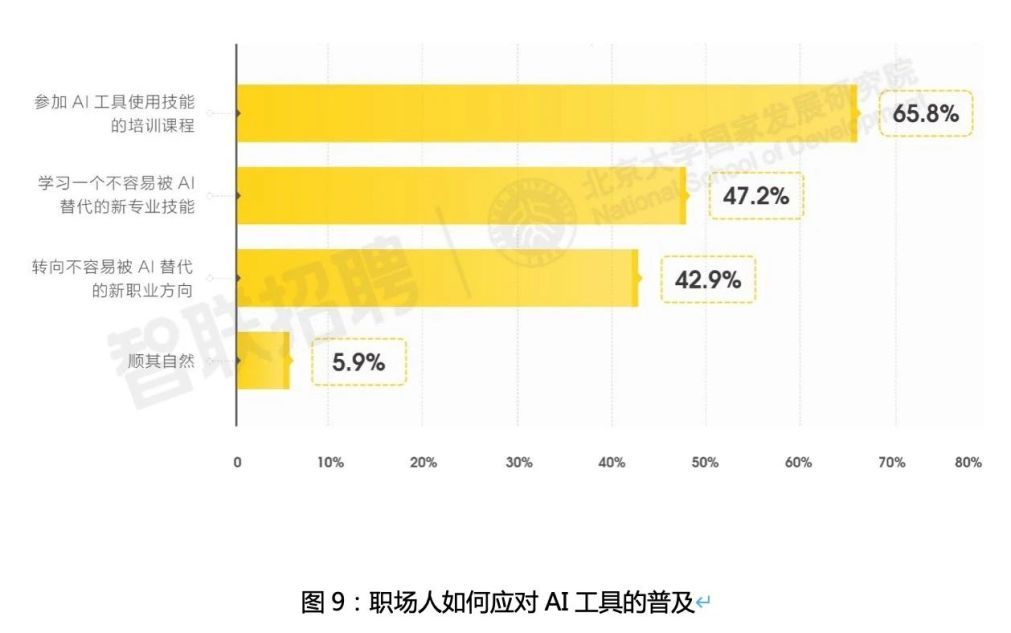 这表明,长期来看,面对AI给职业发展带来的影响,职场人普遍较为积极,通过采取各种措施应对AI技术对职场的冲击。大部分职场人更倾向于通过参加培训课程提升相关技能,从而更好地驾驭人工智能。