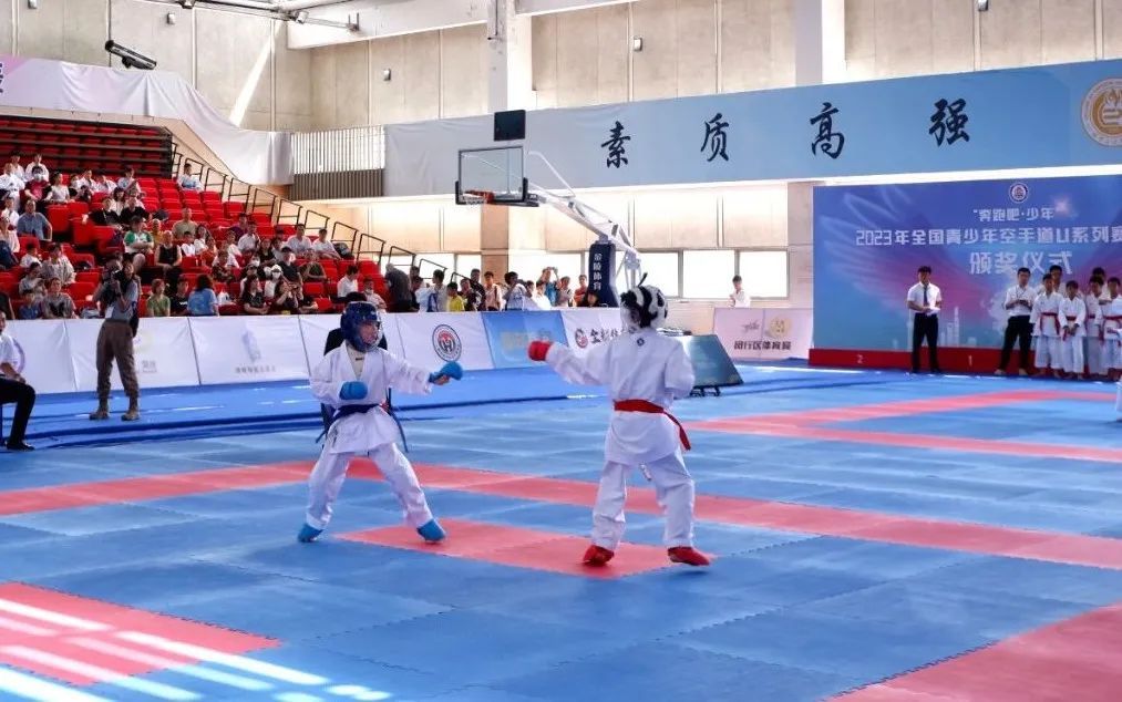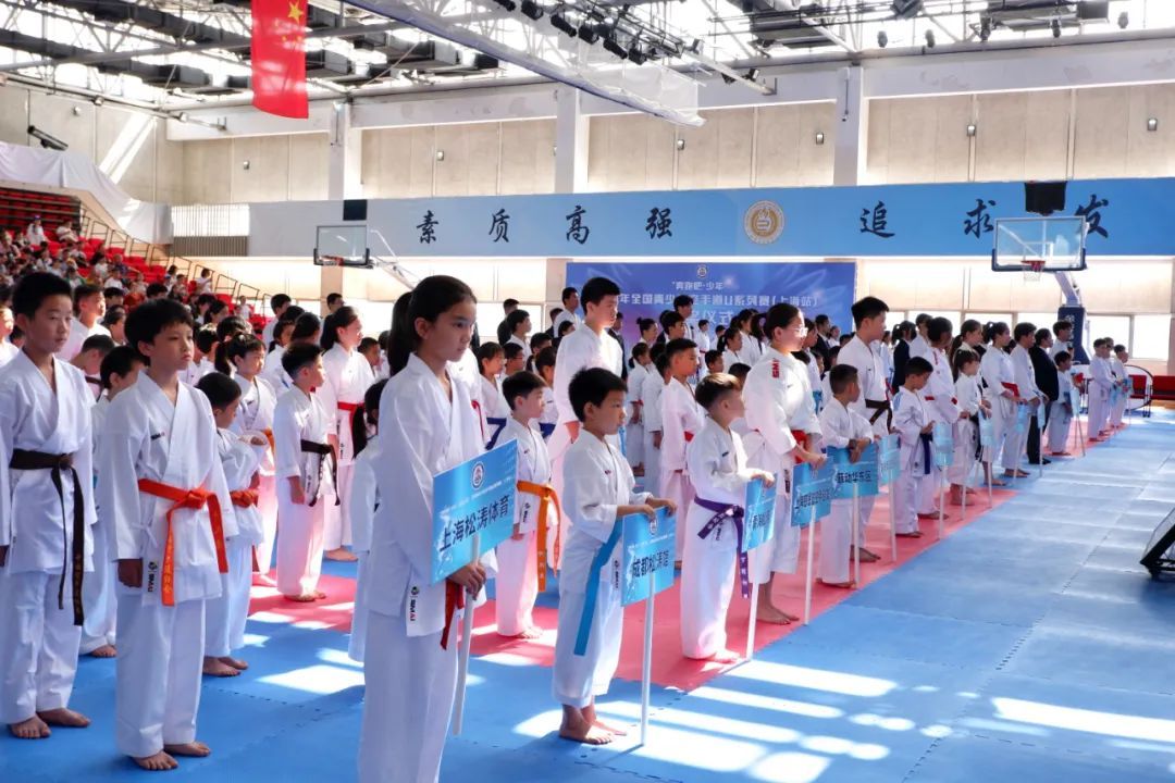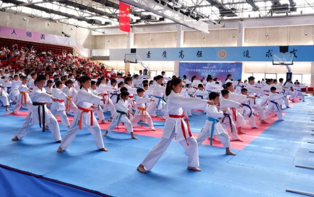 7月21日,“奔跑吧·少年”2023年全国青少年空手道U系列赛(上海站)在华东师范大学体育与健康学院正式开赛,来自全国各地23支代表队的515名运动员,将在未来三天的比赛中激烈角逐,向各个公斤级别的58枚冠军奖牌发起冲击。 开赛首日现场举行了开幕式,“嘿!哈!”随着一阵阵铿锵有力的喊声,一群身着白色道服的青少年选手代表为观众们上演了一组精彩的空手道表演。他们动作娴熟,演示冲拳、踢腿等动作,在一招一式中展示了空手道刚柔并济的美感和魅力。