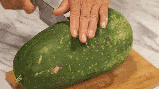 挑选冬瓜的时候可以选择外形匀称、没有斑点,瓜瓤少、肉质厚实,购买时掂一下,分量重的冬瓜肉厚瓤少水分足,是品质相对比较好的。现在市面上的冬瓜一般分为两大类,黑皮冬瓜外皮呈深绿色,体积较大,它的肉质厚实无空心,口感脆爽,适合炒菜、炖汤吃。白皮冬瓜的外表是青绿色的,它的表面常常带有一层厚厚的白色蜡粉。这种冬瓜体积略小一些,皮厚肉薄,适合炒菜、涮火锅,但却不适合炖汤,时间一长容易炖烂。