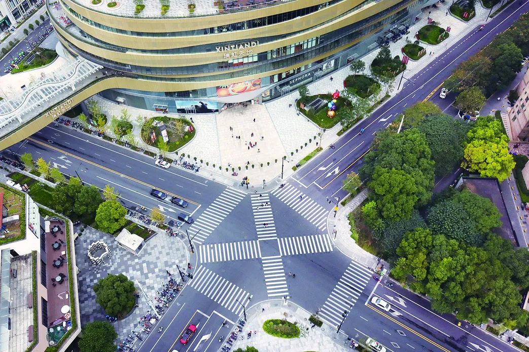 行人信号灯绿灯时,无论是直行还是右转的车辆都要停下来,行人可通过六条斑马线通行,避免人车抢道的情况发生,通行安全和通行效率得到了很好的保障。