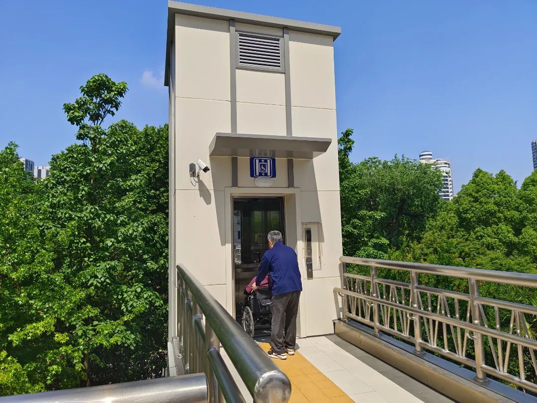 为了让老年人或行动不便的人士在使用人行天桥时更加顺利,近年来,虹口为部分人行天桥加装了电梯,手指轻轻一按,就能上下天桥。