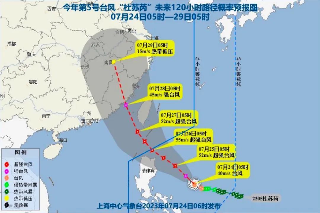 今年第5号台风“杜苏芮”(台风级)(英文名称:Doksuri;名字来源:韩国;名称意义:一种猛禽,鹰),于21日上午(北京时间)在菲律宾以东洋面生成,23日05时加强为强热带风暴,17时加强为台风,今天(24日)早晨05时其中心距离上海南汇嘴约1800公里的西北太平洋洋面上,就是北纬15.4度、东经127.0度,中心附近最大风力有13级(40米/秒),中心最低气压为960百帕,七级风圈半径300~360公里,十级风圈半径100~160公里。