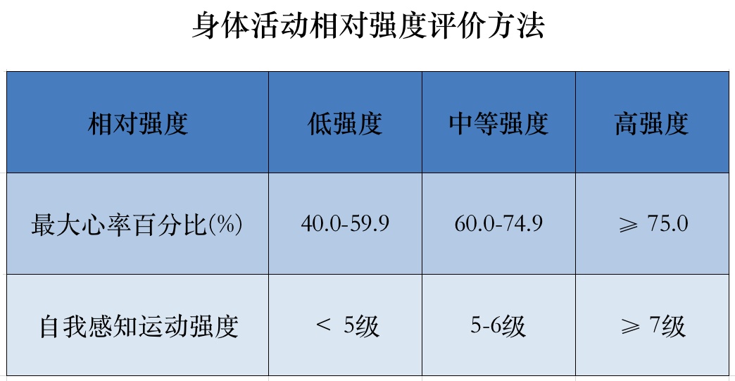 通过个体主观用力和疲劳感的程度来判断身体活动的强度,可采用0-10级自我感知运动强度量表测量。0级:休息状态,1-2级:感觉弱或很弱,3-4级:感觉温和,5-6级:中等,7-8级:疲惫感,9-10级:非常疲惫。