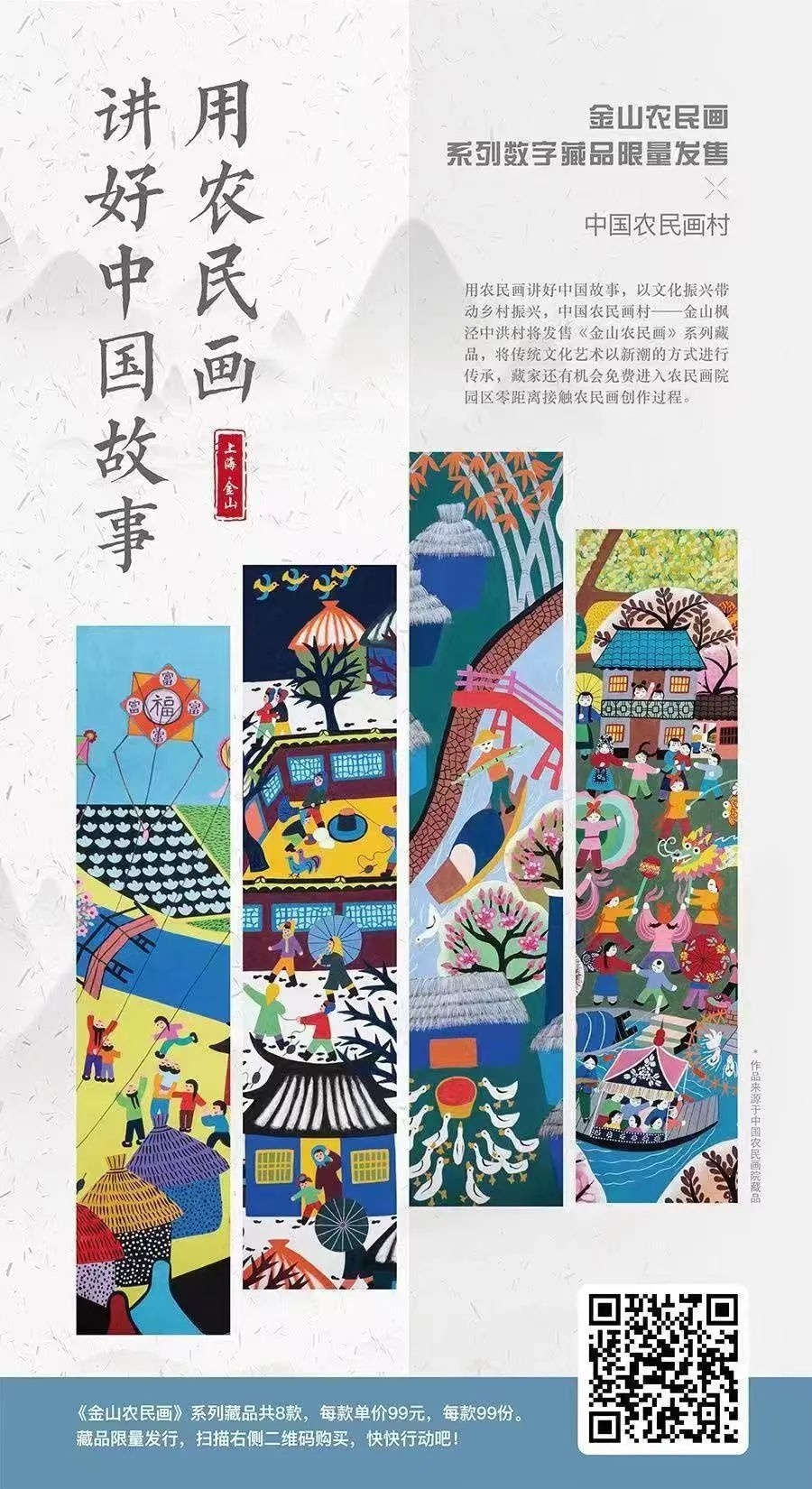 数字藏品的“出圈”在赋能文旅产业方面正发挥着越来越重要的作用。7月25日,由枫泾镇中洪村与上海寺页科技有限公司联合发行的《金山农民画》系列数字藏品将在唯一艺术平台上上线,面向全球正式发售! “中国农民画村”——中洪村,位于枫泾镇西北部。上世纪60、70年代,中洪村的一些农民将印染、刺绣、木雕、剪纸、灶壁画等古老的艺术巧妙地融入到绘画作品中,走上了农民画创作之路,通过这些画家数十年如一日坚持创作,培育出了充满生活气息和艺术表现力的金山农民画,也为中洪村埋下了文化艺术的“种子”。 近年来,位于中洪村的“中国农民画村”内聚集了一批富有情怀的高水准农民画家,以画为业,以画为生。随着农民画赋能乡村振兴的文章越做越精细,如何令中洪村的金山农民画文化品牌更加响亮,让艺术振兴乡村之路越走越宽?成为摆在中洪村两委班子面前亟待探索的关键问题。而数字藏品,正是传统文化与新兴产业碰撞产生的新载体。 作为一种限量发行的虚拟文化商品,相较于传统藏品的局限性,数字藏品的品类丰富,其本质与小时候收藏的邮票等相似,但却是以电子数据的形式进行呈现,每一份数字藏品都对应特定的数字化作品、艺术品和商品,拥有区块链上独一无二的序列号作为唯一所有权凭证。 将乡村特色文化进行数字化开发,不仅保护了乡村非遗文化本身的价值,也通过新业态助力乡村产业升级,带动区域经济发展。“将部分精品农民画版权进行数字化发行和销售,每幅画一经发售不仅创造了更高的经济效益,还可以不断扩大农民画的知名度带动全域产业发展。”中洪村党总支书记、村委会主任曹海说。 据了解,此次在唯一艺术平台上上线的《金山农民画》系列藏品,将传统金山农民画资源充分创意开发,是一次将传统文化艺术以新潮的方式进行创新、传承的探索。藏品共分8款,每份售价99元,每款限量发行99份。购买此款数字藏品的消费者可以足不出户领略江南水乡的风土人情,感受金山非遗技艺的独特魅力,甚至还有机会获得免费进入农民画院园区零距离接触农民画创作过程。 “数字藏品是当下最具火热的市场,发布《金山农民画》系列藏品是一场全新的尝新,不仅赋予了金山农民画鲜活时尚的形象,也有力于宣传中洪村的村落文化旅游特色,助推文化产业的发展与布局。”曹海告诉记者,他们想通过年轻人喜欢的方式,让更多人了解金山农民画,提升金山农民画品牌影响力,同时充分感受到中洪村的无穷魅力,助力中洪村农文旅的高质量发展。 据悉,未来,中洪村将积极利用数字藏品创新各类更契合当下年轻人潮流的互动玩法,立足中洪村的人文特色和丰富的旅游资源,通过NFT数字藏品助力产业+文化+旅游链优化整合,共同探索数字藏品对农文旅领域的带动作用,持续放大金山农民画的辐射与带动效应,推进中洪村农文旅产业的整体发展,助力乡村振兴高质量发展。 购买方式:扫描下方二维码直接购买。 上线时间:7月25日(北京时间20:00) 特别说明:购买该数字藏品的用户可以在唯一艺术数字艺术电商平台登录领取,但暂不能以二次销售、寄售、转赠等形式进行交易。 通讯员 | 李晨辉 编辑 | 翁羽