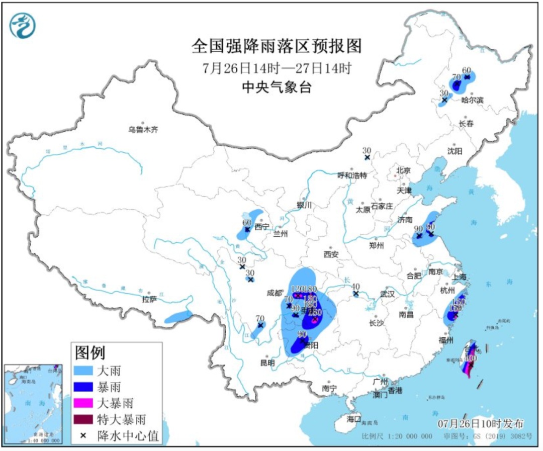 中央气象台26日10时继续发布暴雨蓝色预警。预计,26日14时至27日14时,黑龙江西南部、吉林西部、青海东部、四川盆地、重庆西部和南部、贵州中西部、山东南部、江苏北部、浙江东部、台湾岛等地部分地区有大到暴雨,其中,四川盆地东部、重庆西部、贵州北部、浙江东南部沿海等地部分地区有大暴雨,台湾岛东部和南部部分地区有大暴雨到特大暴雨(250~400毫米);上述部分地区伴有短时强降水,局地有雷暴大风等强对流天气。