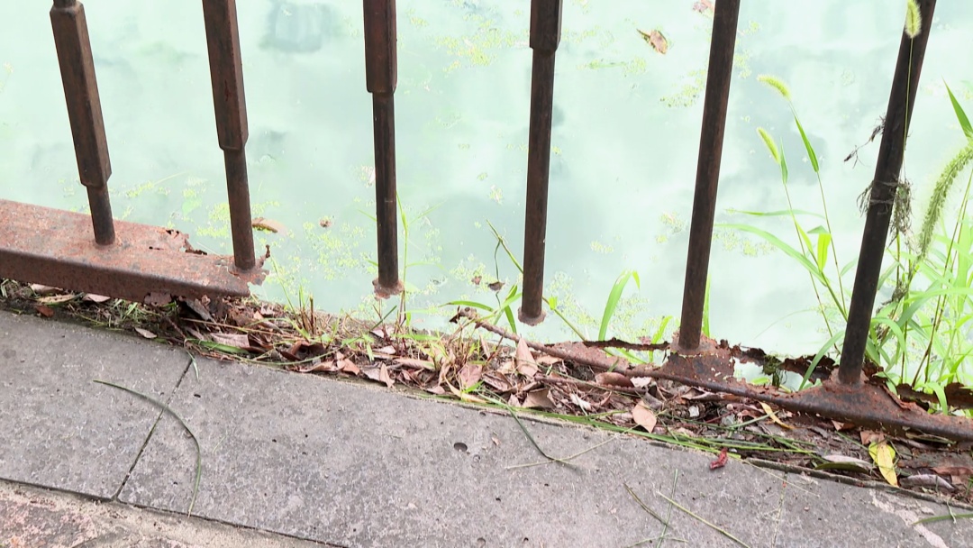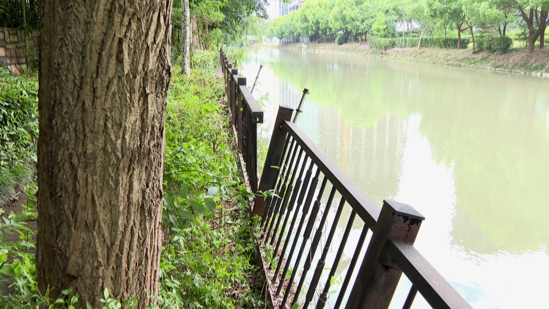长陆泾河位于G60科创云廊和英郡雷丁小城居民区中间,记者在现场看到,河道一侧的铁质栏杆已有多处缺损,一些栏杆向河面一侧倾斜,用手一推来回晃动。在附近上班的居民王先生告诉记者,2022年上半年他就发现这一问题,“护栏都已经锈迹斑斑、摇摇欲坠。也曾跟物业反映过,物业说不属于他们的管辖范围,居民们就自发用铁丝和螺纹钢固定”。