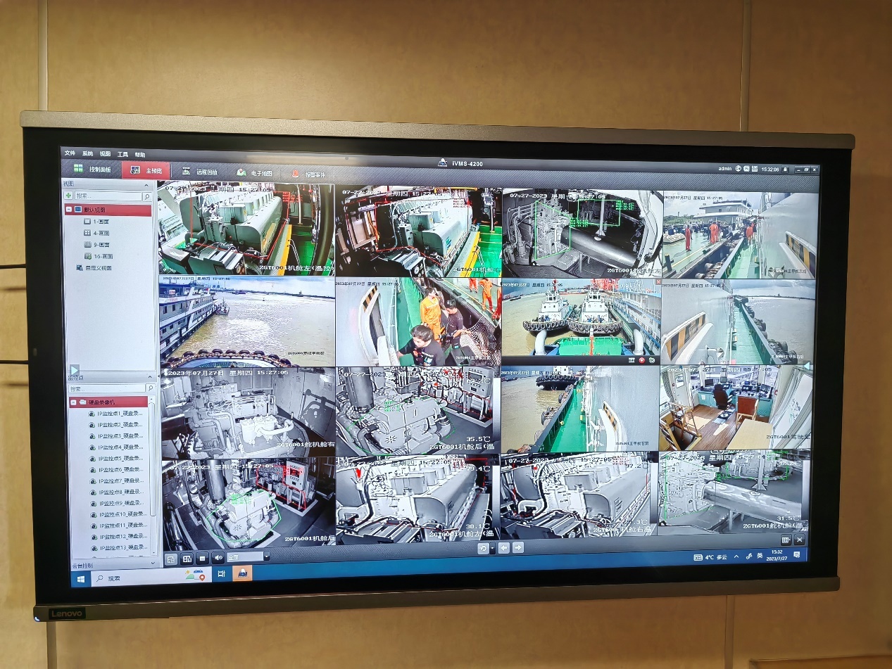 在机舱会议室内的船舶管理系统大屏幕上,显示着全船的16个空间画面,温度参数等在画面可以实时显示。“这些都是可感温监控摄像头,一旦温度过高会实时报警。”镇江港务集团轮驳分公司设备经理冀鹏介绍说。下午4:48,记者看到,机舱室的温度显示为44℃,船员笑称,“这是正常温度,以前每次下机舱都是一身汗,现在不用遭罪了。”