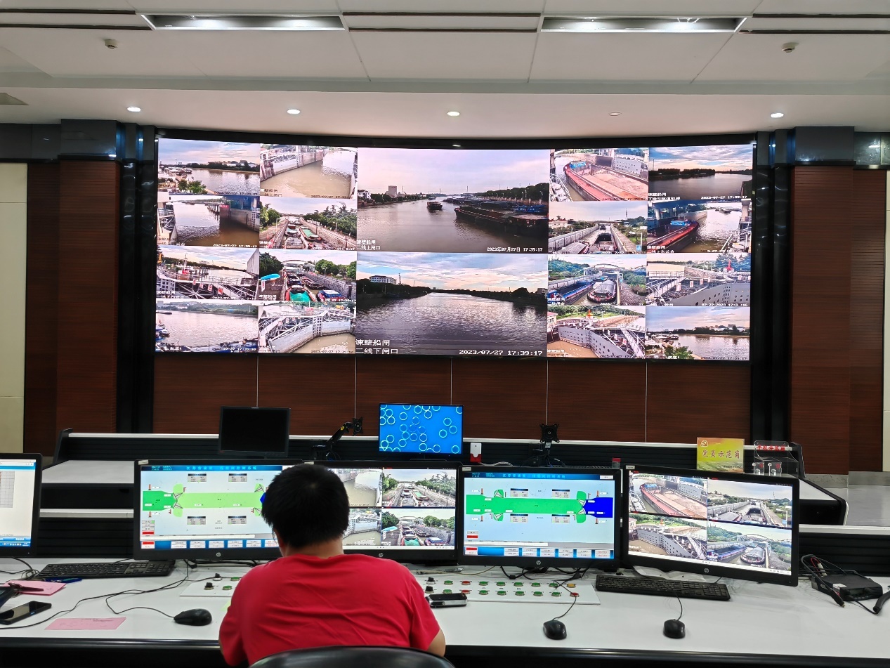 船闸一侧的运调楼船闸指挥中心内,记者看到,该航道外场系统搭载的视频功能对船舶的航行及两岸基础设施运行情况进行着全方位动态监管,“通过系统可以将过闸、气象等信息推送给船民。”薛文骏说。