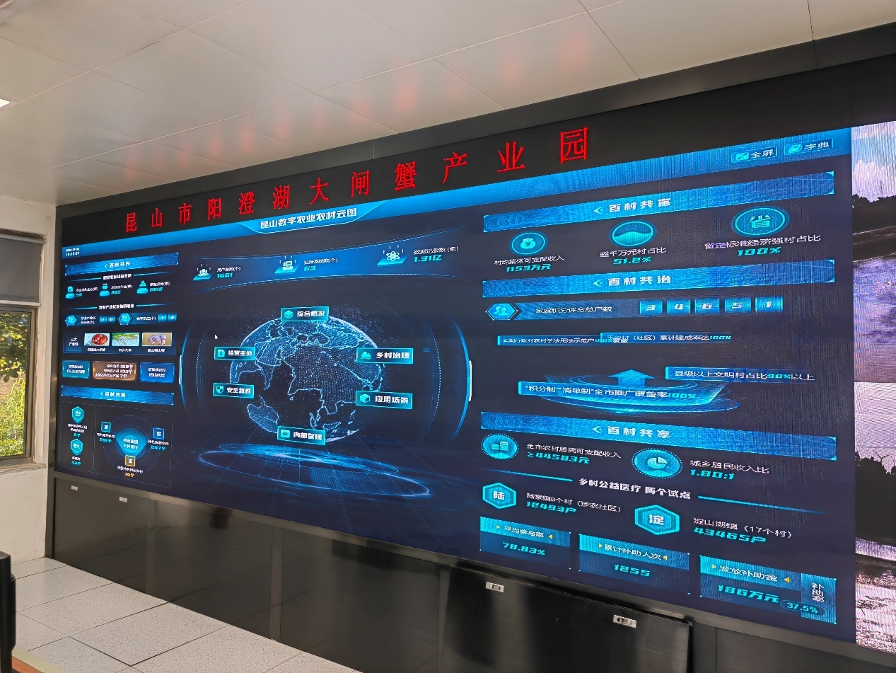 驱车十分钟,便可来到位于隔壁龙潭村的昆山澄湖大闸蟹产业园办公室,在中控室巨大的屏幕上,昆山各个蟹塘的实时场景尽收眼底。