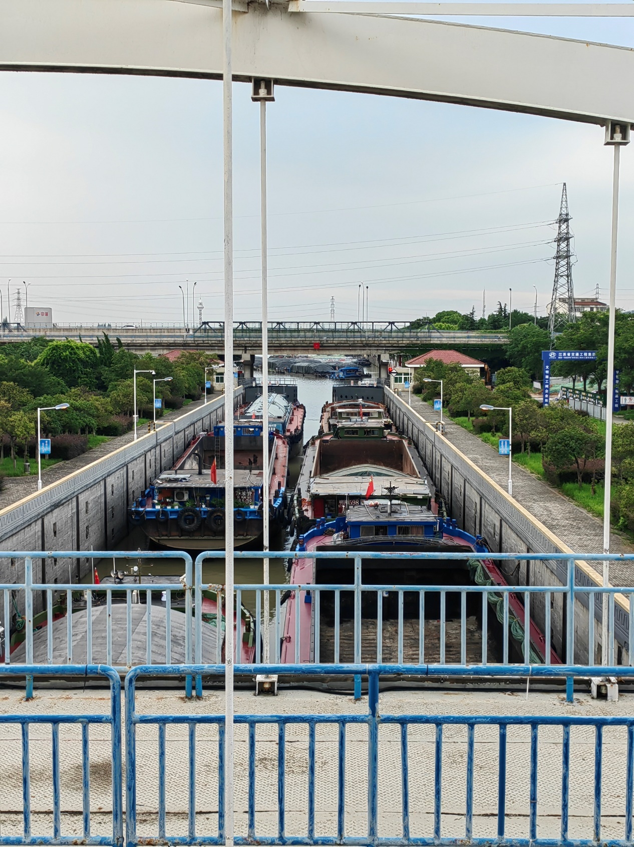沿着长江镇江段进入京杭运河苏南段,要通过“江南第一闸”谏壁船闸。7月27日傍晚5:20,记者来到谏壁二线船闸时看到,来自山东、安徽等地的船舶正在排队过闸。