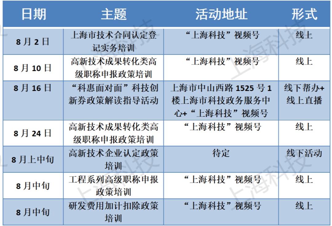上海市科学技术委员会8月期间集中开展本市科技创新政策宣讲系列活动,活动将围绕高新技术企业认定、技术合同认定登记、科技创新券申领、高新技术成果转化职称申报、研发费用加计扣除等热门科技创新惠企利民政策开展解读和帮办指导。