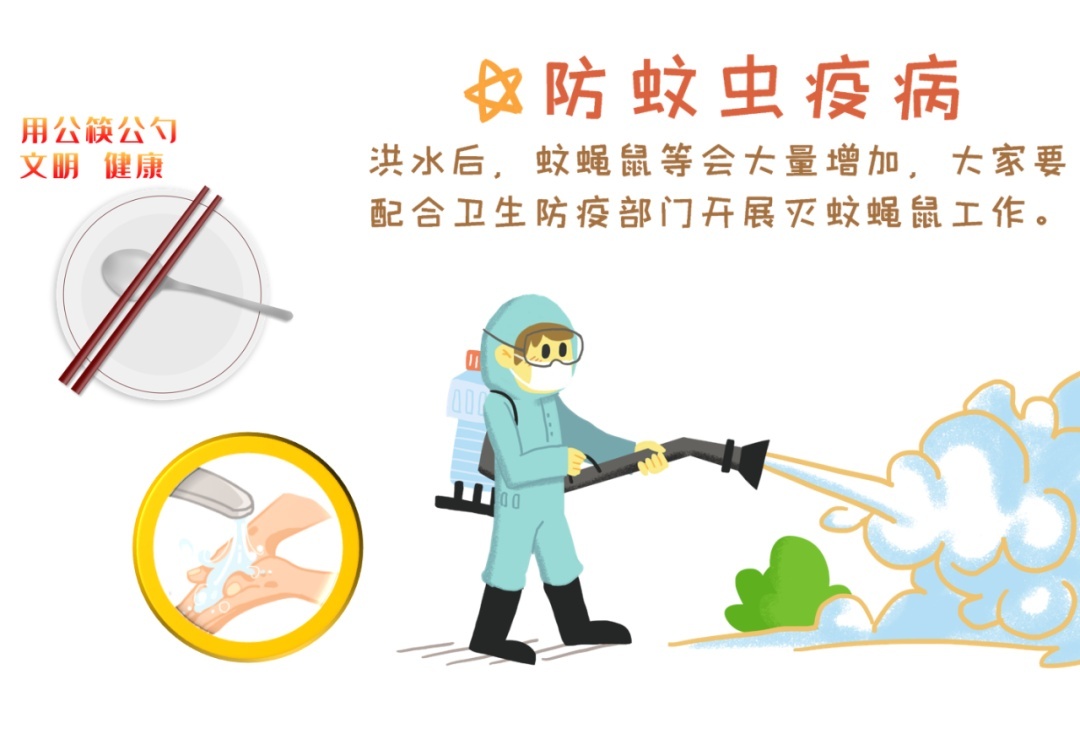饭前便后、接触过洪水后要洗手。切配的刀、板和盛装熟食的容器,在使用前要清洗干净,并用滚开的水或蒸煮等方式消毒杀菌。洪涝灾害过后,要及时清除室内外淤泥、垃圾、积水,防止蚊蝇滋生,保证环境清洁卫生;要及时对食品生产加工的设备、设施、用具和内外环境进行彻底清洁、消毒,避免二次污染。提倡文明用餐,使用公勺公筷。减少食品浪费。