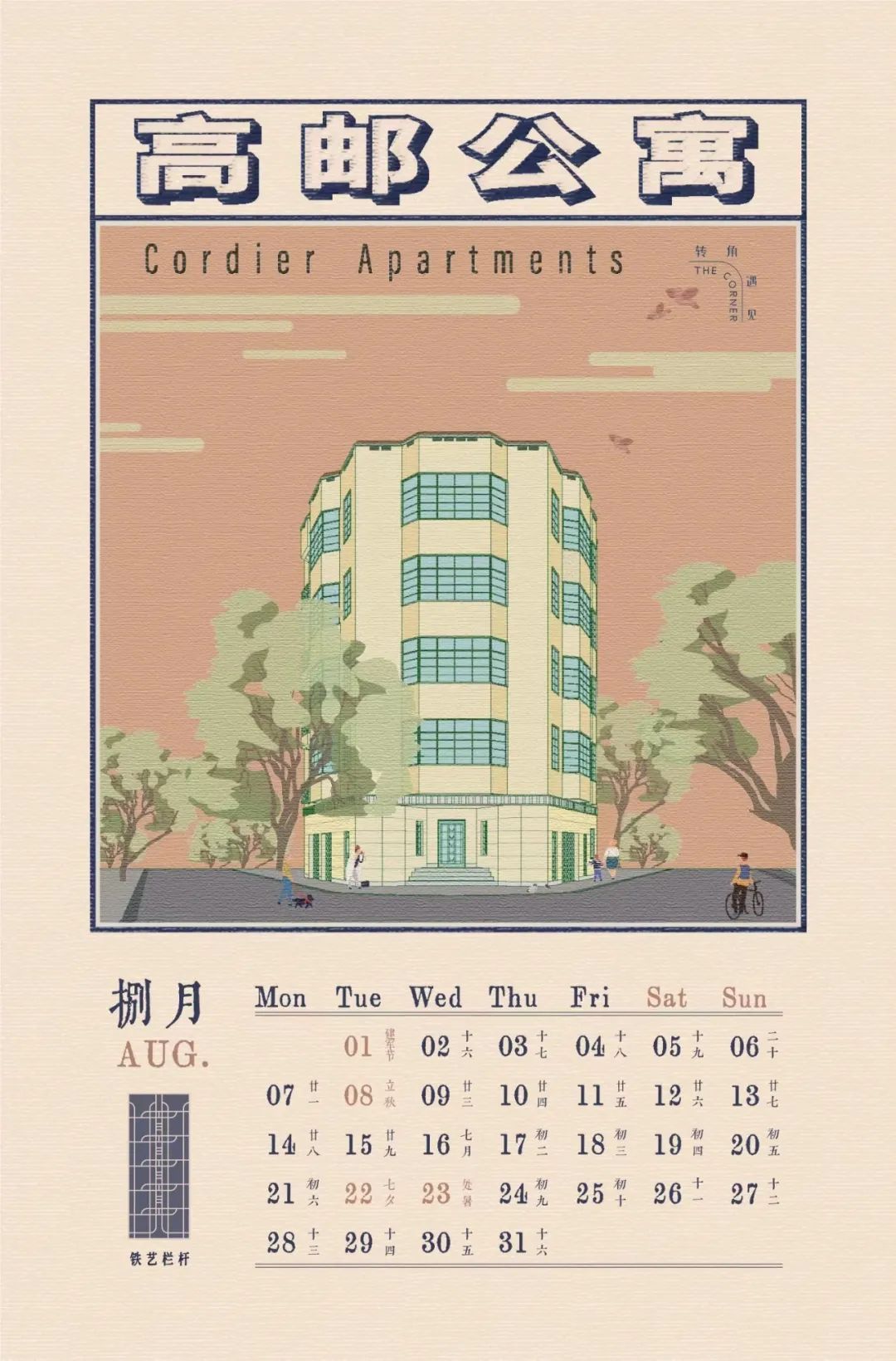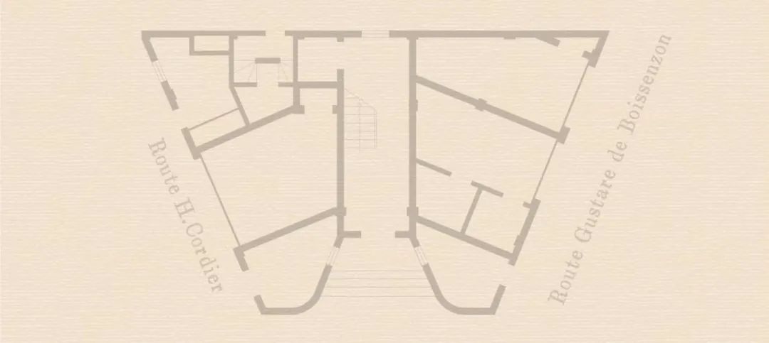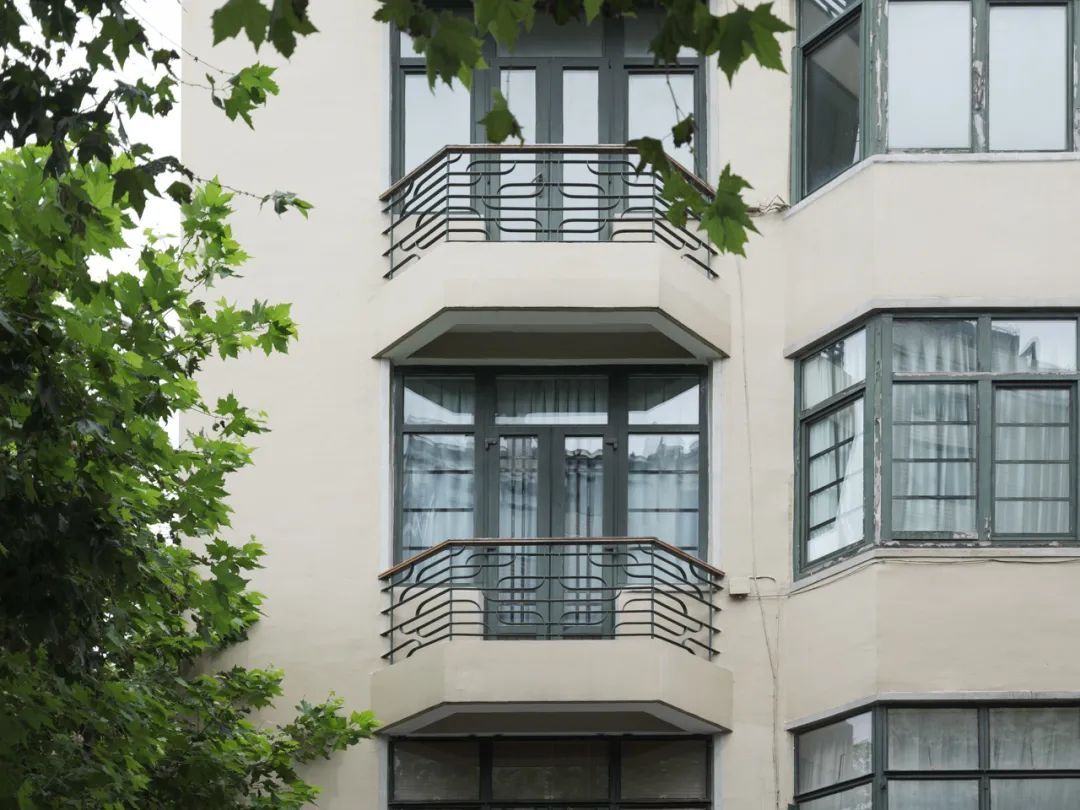 建筑沿道路转角布置,平面呈楔形。以楔端为构图中心,底层为入口,两翼向后逐渐扩展,利用阳台和平面的凹凸形成层次丰富的立面形象,以外凸窗户和半六边形阳台形成竖向线条,同时也构成现代居家生活必需的空间。立面造型简洁,外墙底层采用灰色水泥饰面,二至五层采用米黄色水泥饰面,墨绿色钢窗,阳台配有几何图案的黑色铸铁栏杆,腰线及女儿墙处采用造型简洁的装饰构件。平面功能布局科学合理,装修精致,设备齐全,室内通风采光良好。一层原为入口大厅、汽车间、辅助用房、商铺等,二至五层为一梯一户的四室户,房间功能明确,设备俱全,除了卧室、起居室、客厅,还设有餐厅、厨房,厨房边设佣人房、浴厕等,分隔墙和过道嵌有壁橱,垂直交通设主楼梯和辅助楼梯,分户门设门厅(玄关)。朝东的转角布置客厅,这里视野最佳,卧室安排在朝南的一侧,带有阳台,而餐厅和厨房则放在光线较差的北侧。室内交通上,为了避免产生主客同佣人服务流线产生交集,设计了两条通向室内各房间的路线,一条是主人可随意行走于各房间的流线,另一条是门外走廊供佣人使用到达各房间。
