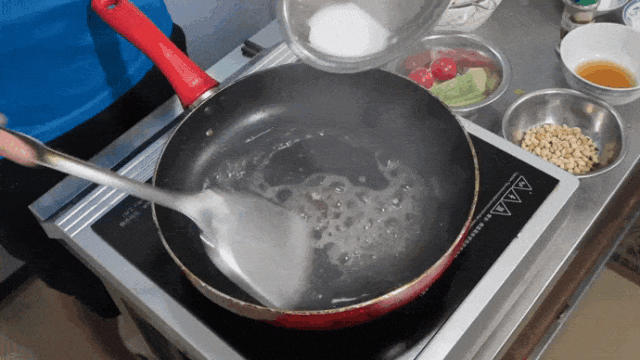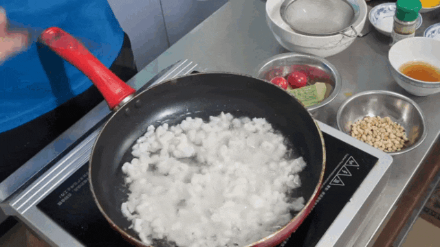 取出鱼米,下油锅炒至变白,下青红椒丁,盛出备用。