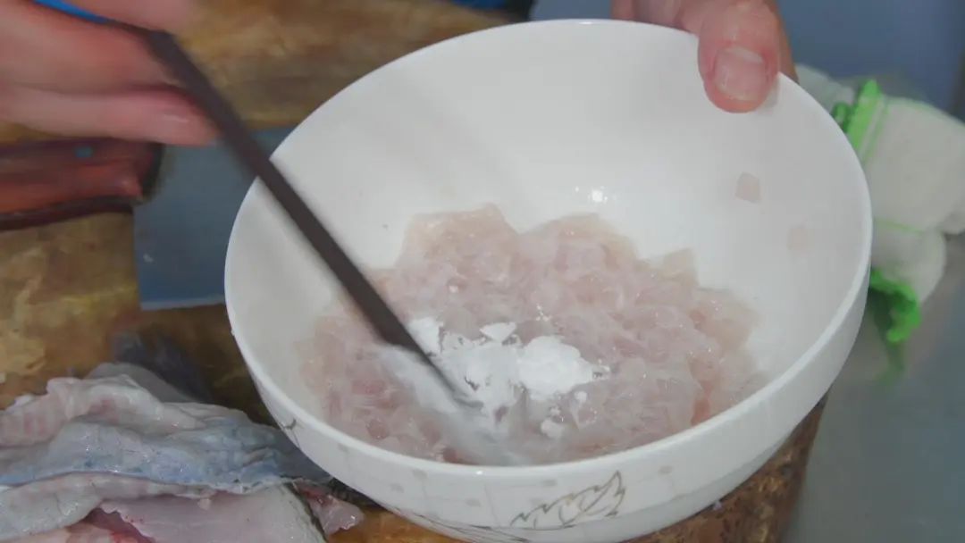 鸡蛋清、味精、盐、少许糖和胡椒粉放入鱼肉丁中搅拌,再加入生粉搅拌,放入冰箱冷藏备用。