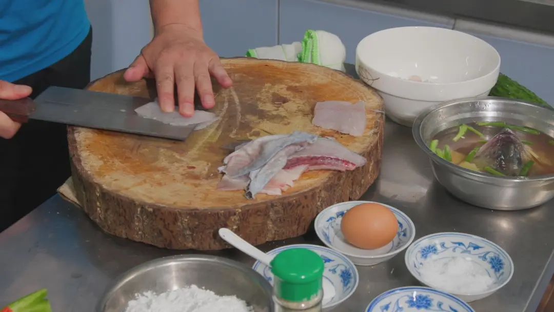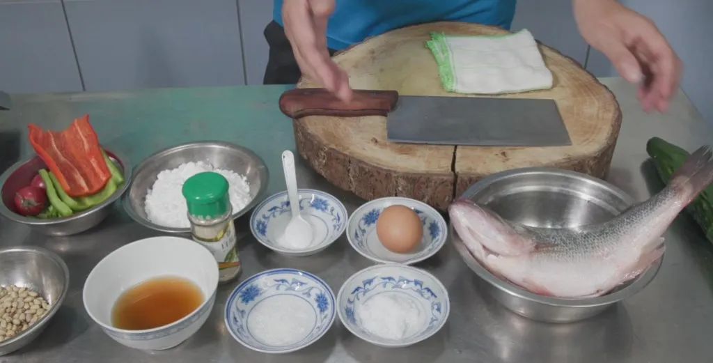 将鲈鱼改刀,留下鱼头、鱼尾及鱼肉部分。鱼头和鱼尾用料酒和葱姜腌制一下;鱼肉切成丁。