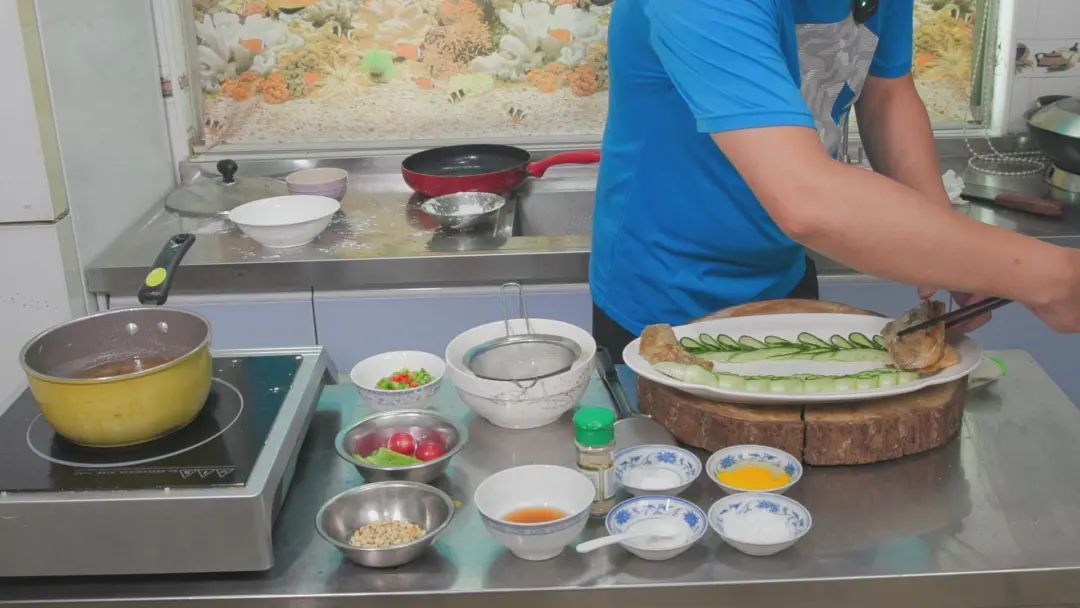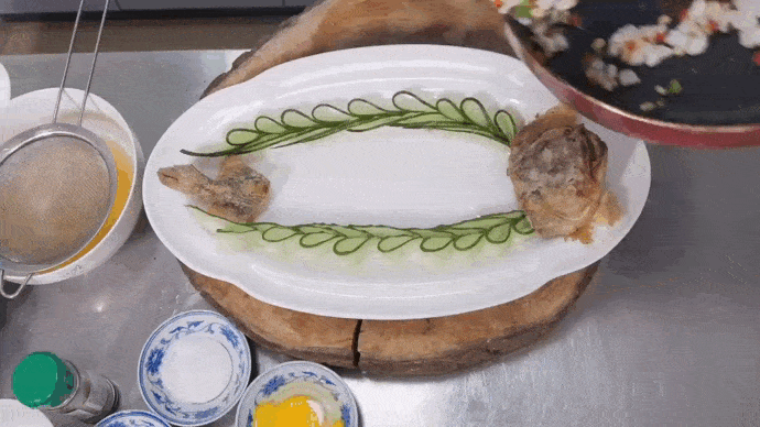 把松子先炒熟,放置一旁备用。鱼头和鱼尾先过油炸熟,摆盘。