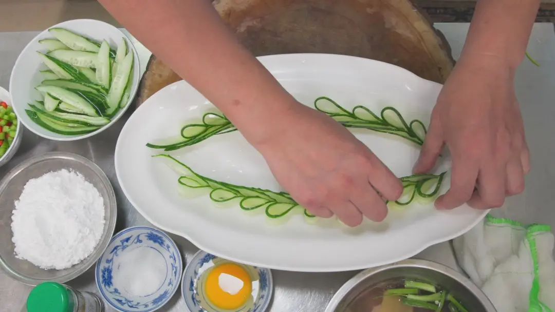 准备配料,青红椒切成丁;黄瓜改花刀做围边装饰。