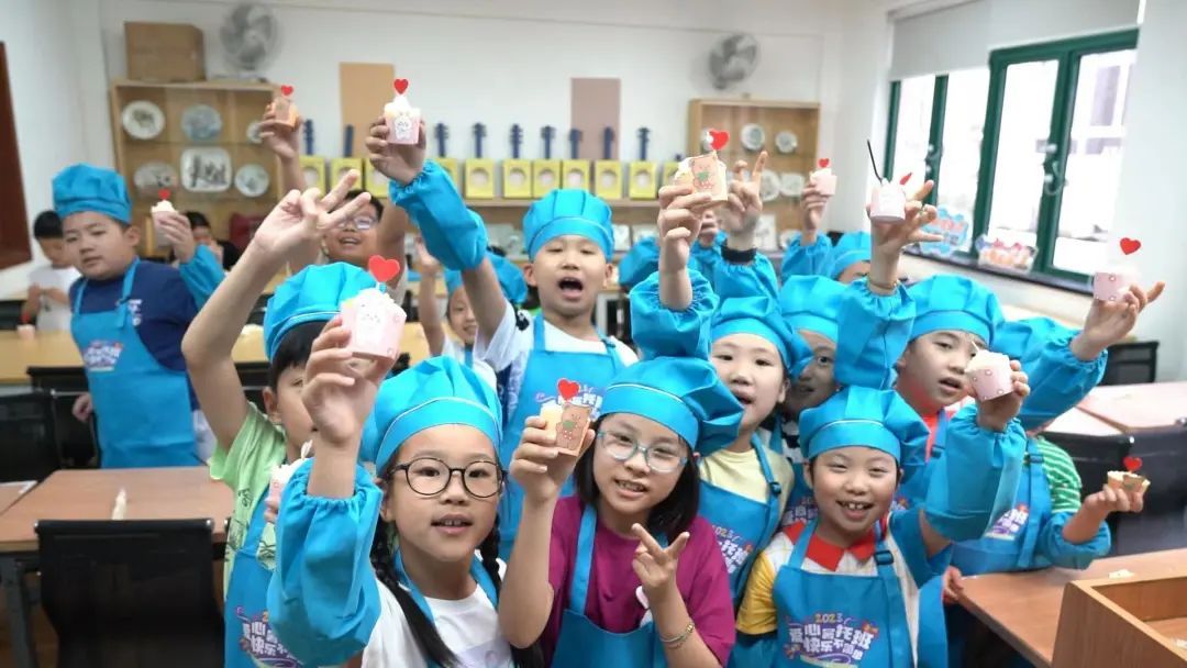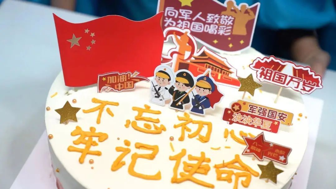同时,还特别安排了小朋友们喜欢的烘焙课程,孩子们换上小厨师装备,认真观摩甜品老师打发奶油、裱花,对食材和制作方法充满好奇。教室里散发出阵阵蛋糕香味,小朋友们迫不及待地自己动手,在制作的过程中,孩子们充分发挥想象力和创造力,把“八一精神 永放光芒”等爱国爱军元素装饰在蛋糕上,表达对军人、对祖国的热爱之情。
