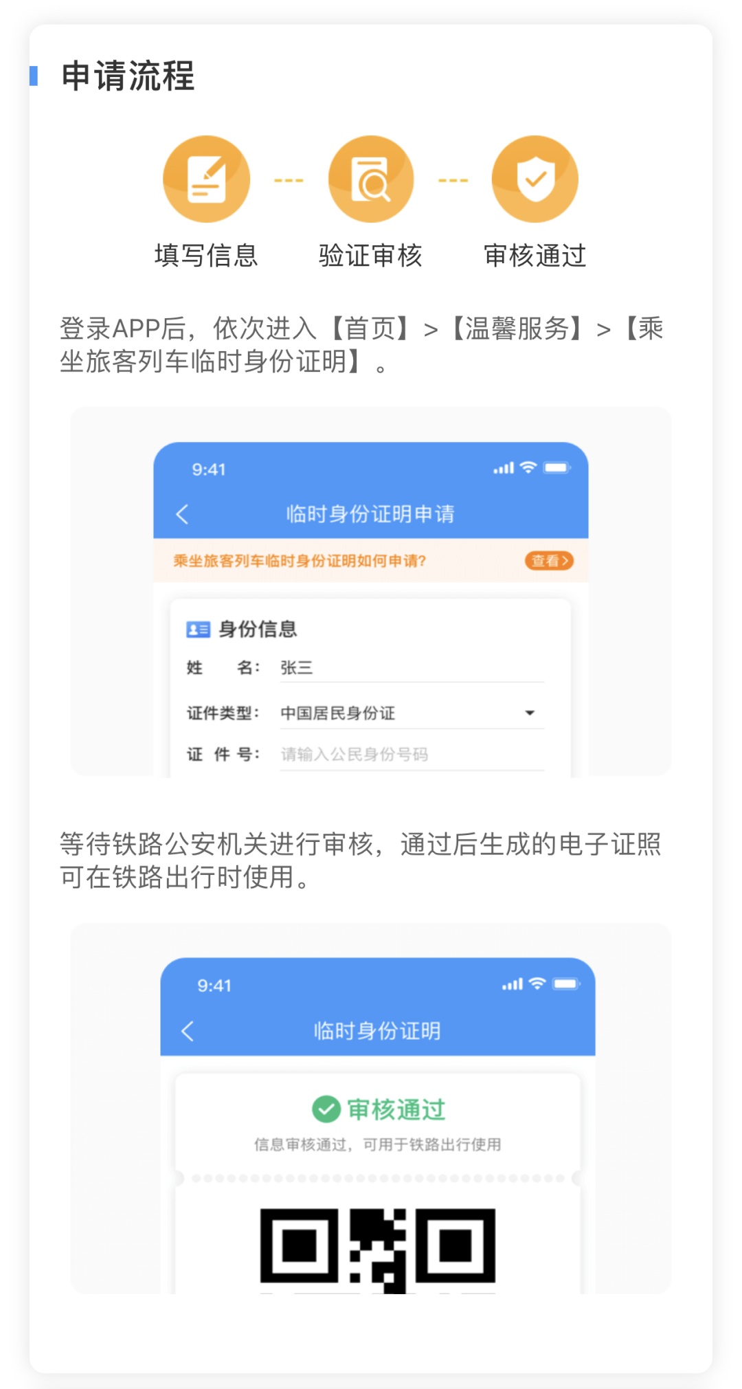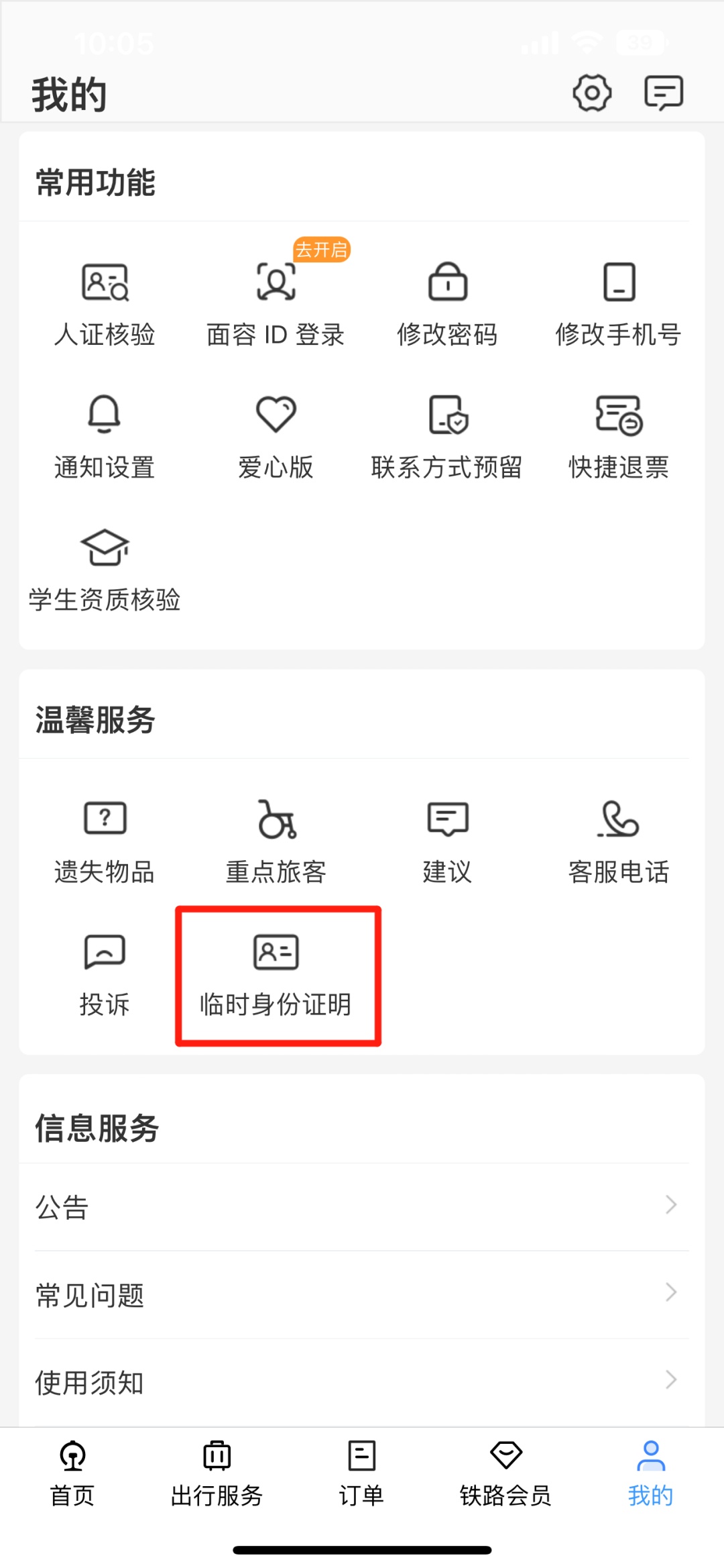 在铁路12306APP首页,点击“我的”,找到“温馨服务”,即可办理电子临时乘车身份证明。