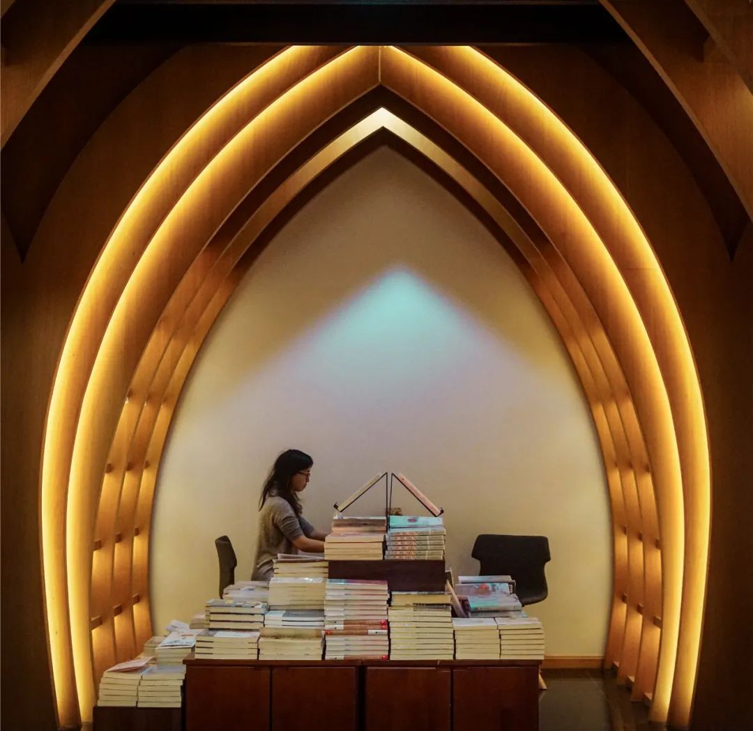 登复古益梅堂。老烟囱、伴立边旁。观拱门桌椅台阶处,宽敞坐、日映晴窗。展图史、列陈环壁,计三千卷藏。更有那、地方刊物,漫溢书香。