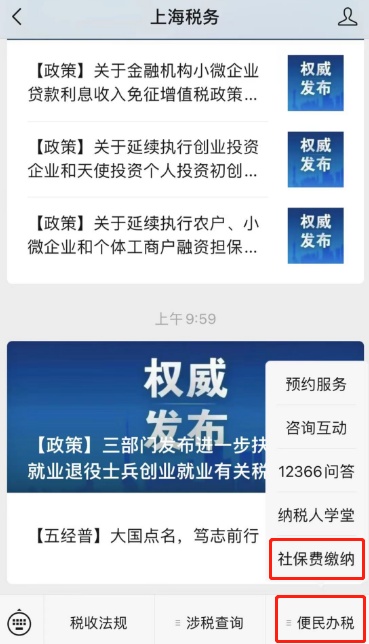 点击“上海税务”微信公众号——便民办税——社保费缴纳,即可完成办理。