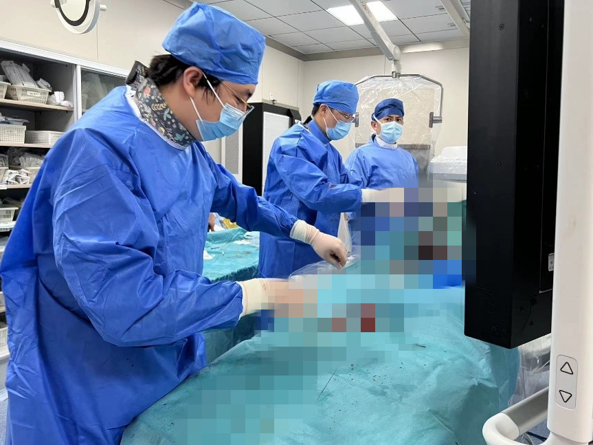手术当天,在殷敏毅教授的悉心指导下,医院血管外科团队有条不紊地进行操作。“手术开始得并不顺利,由于患者股动脉迂曲蜿蜒异于常人,进入血管内的导丝和导管穿行起来十分艰难。”血管外科团队杨成昊医生向记者回忆,从手术开始到第一枚主体支架被顺利地送到了瘤体处,就用了整整40分钟。