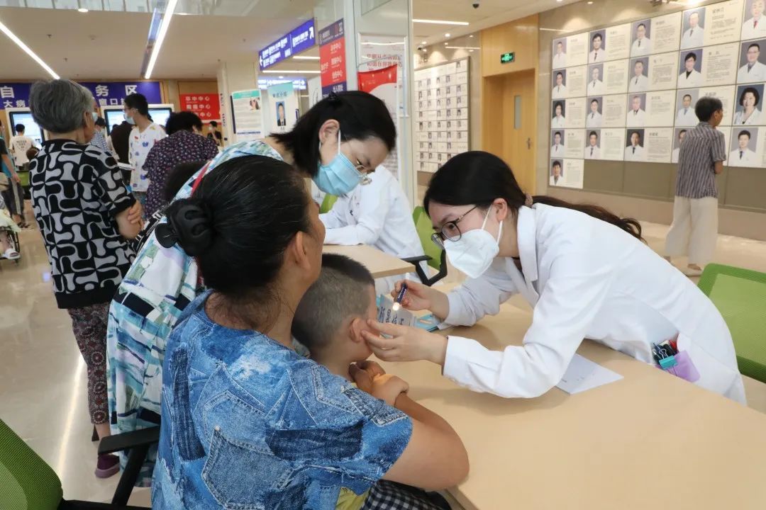 8月5日,在同济大学附属上海市第四人民医院举办的“暑期儿童眼健康”义诊活动中,不少家长带着孩子前来,就各类近视问题向眼科医生咨询。