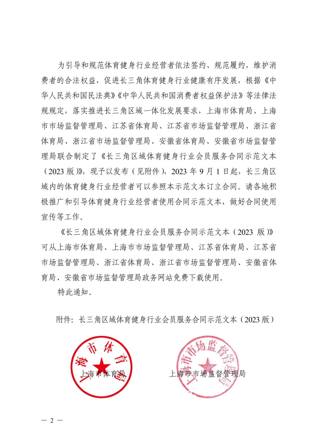 为引导和规范体育健身行业经营者依法签约、规范履约,维护消费者的合法权益,促进长三角体育健身行业健康有序发展,根据《中华人民共和国民法典》《中华人民共和国消费者权益保护法》等法律规定,落实推进长三角区域一体化发展要求,上海市体育局、上海市市场监督管理局在2021年发布的《上海市体育健身行业会员服务合同示范文本(2021版)》(以下简称《上海2021版》)基础上,经过调研论证,联合江苏省、浙江省、安徽省体育局和市场监督管理局制定了《长三角区域体育健身服务合同示范文本(2023版)》,于近期正式发布。2023年9月1日起,长三角区域内的体育健身行业经营者和消费者可以参照该示范文本订立合同。