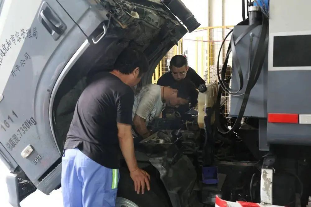 高温下,随着清运工作量的激增,作业车辆不能“罢工”。如缸体过热、水箱“开锅”等清运车辆的“高温病”要避免发生。在没有空调的维修车间里,每天,维修人员们被“蒸”得脸颊通红,或钻到车底,或爬上车顶,不断检查着作业车辆的性能。豆大的汗珠从脸颊往下滴,用手一抹,脸上留下一道黑痕,满是油污的工作服也被汗水浸透,大家为了保障一线清运作业进度,不耽误一分一秒。