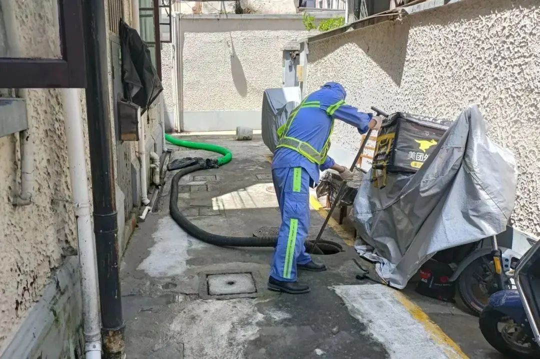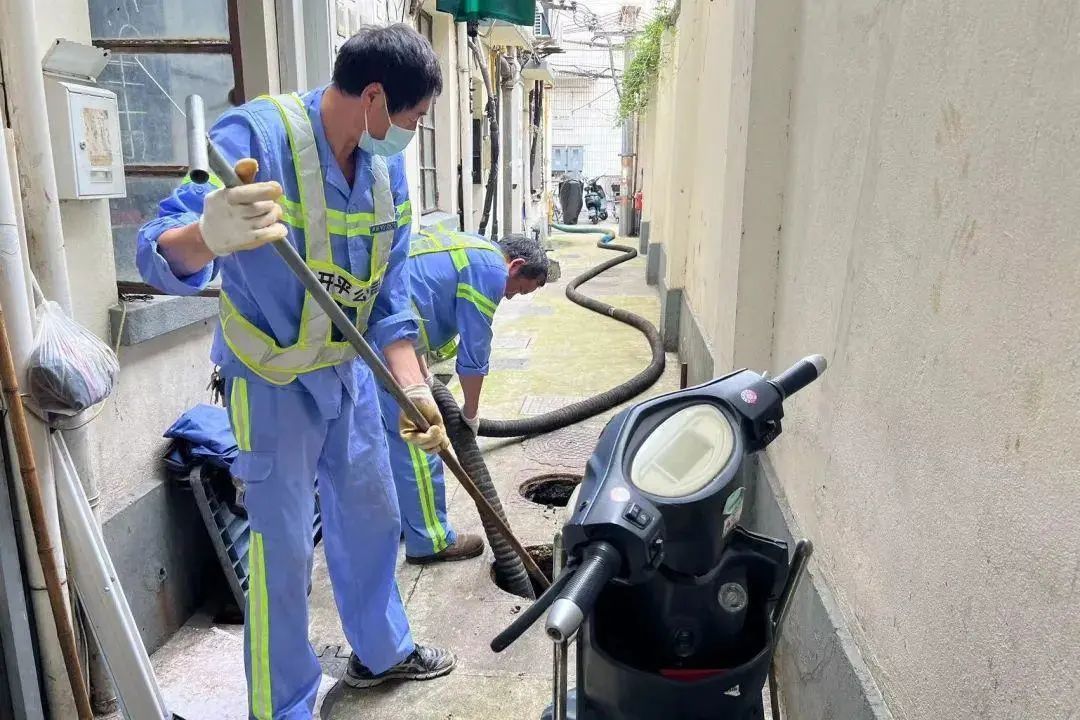 高温天里,难熬的还有一群粪便清运工。因为负责的区域,大多数为老式里弄,狭窄的弄堂里,吸粪车是开不进去的,全靠人力拖着沉重的吸粪管,连续接管进入。只见清运现场,工人们带好口罩,勾开井盖、挪动粪管、控管“打漂”、铁锹搅动、收管归位,整个过程一气呵成,甚至没有一滴粪水落在地上。这是他们一直重复的作业动作,但作业时发酵的粪便恶臭扑面而来,还要不停地翻转抡动,坑内的沼气常常熏得人难以忍受。