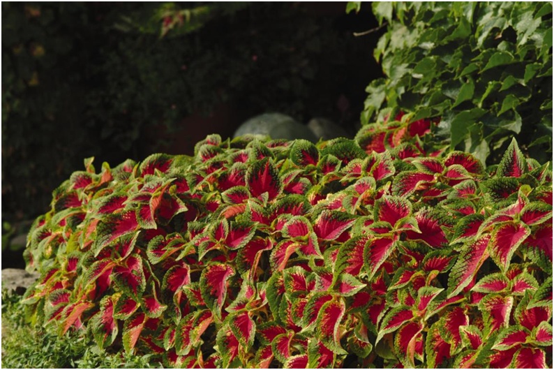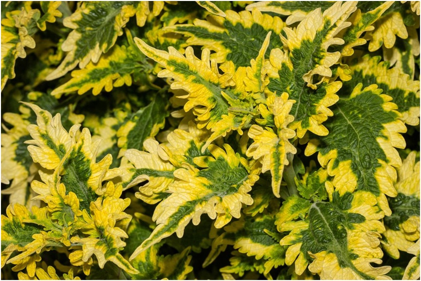 彩叶草,又名五彩苏、锦紫苏、老来少等,是唇形科鞘蕊花属的一种草本植物。它的样子形似紫苏,叶片色彩丰富,具有红、紫、绿、金、白等叶色,能和矾根一比高下,是受欢迎的室内和花园植物,可以盆栽,可以与其他的植物做组合,或者直接用它种满一整个花坛,不管在花园中处于什么位置,它都可以形成十分亮眼的色块。