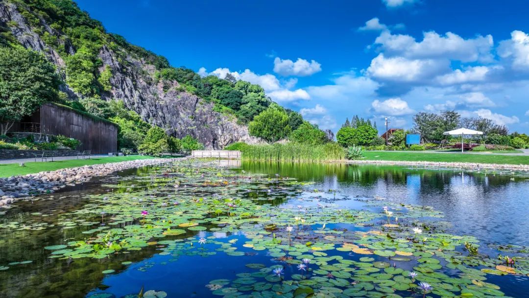 多彩睡莲区,位于矿坑花园镜湖。展示了‘白色狂想曲’、‘蓝鸟’、‘紫乔伊’、‘粉火烈鸟’、‘金色光环’、‘岩山千瓣’等不同色系的热带及耐寒睡莲品种,从冷色调逐步过渡至暖色调,高山飞瀑、镜湖倒影间呈现出睡莲的别样仙韵。