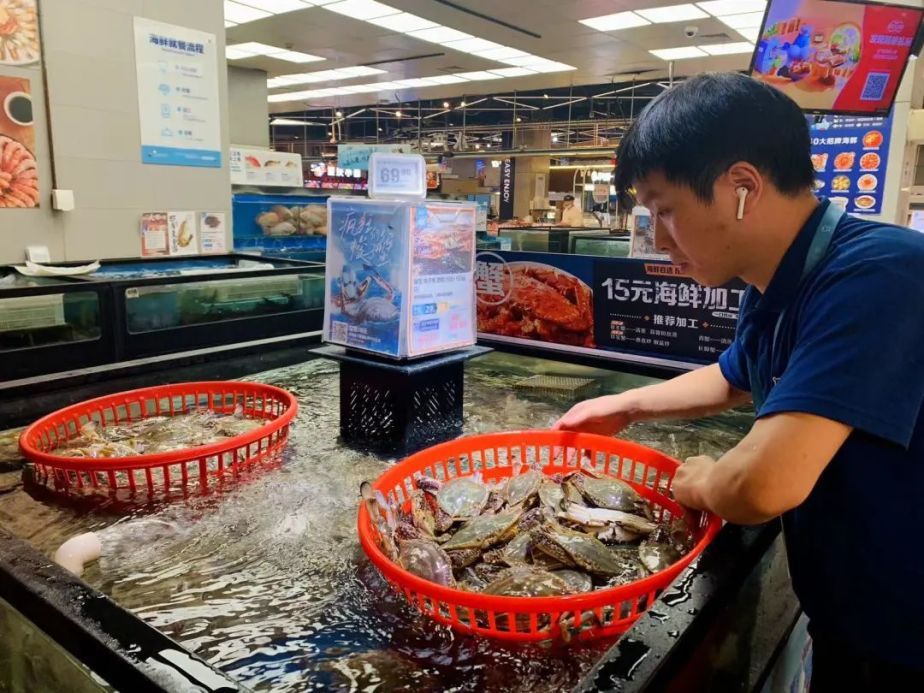 8月7日上午,上海市民已经可以在店内选购今年新上岸的海捕梭子蟹,上市的梭子蟹为2-3两规格,门店同样拥有完整海产养殖设备保证梭子蟹鲜活。