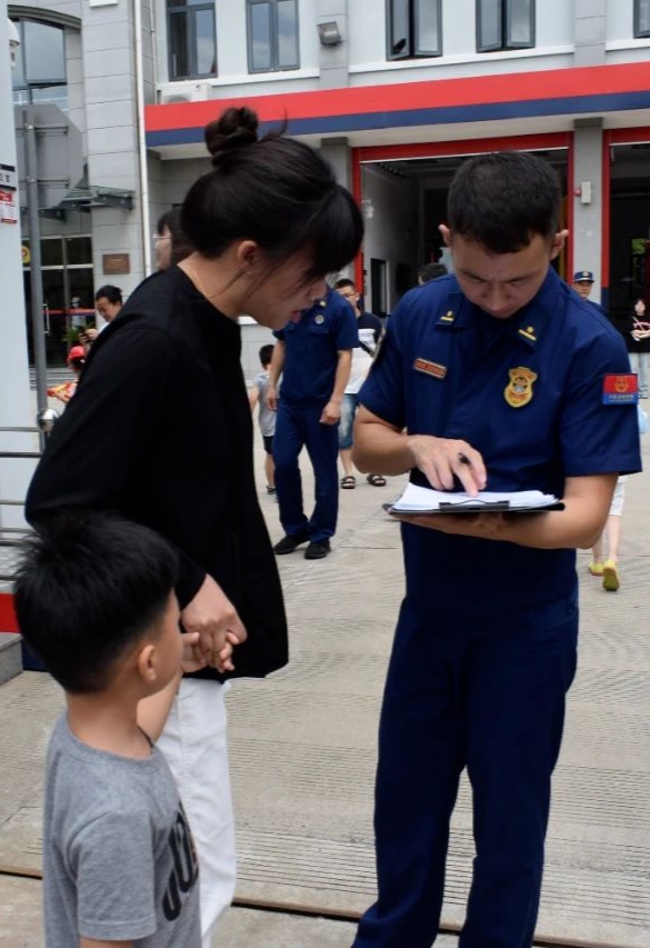 孩子们跟随家长来到消防站,签到后消防员为大家分发了“专属”服装。人员到齐后进行分组,为接下来的参观做准备。